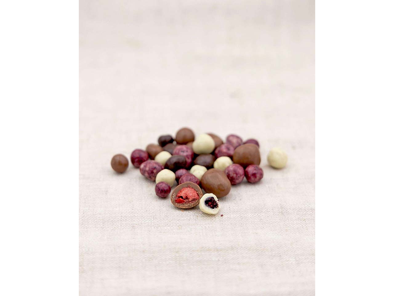 Zartbitter-Schokolade* 30 % (Kakaomasse*, Rohrzucker*, Kakaobutter*, stark entöltes Kakaopulver*, Emulgator: Lecithin (SOJA*)), Vollmilch-Schokolade* 30 % (Rohrzucker*, Kakaobutter*, VOLLMILCHPULVER*, Kakaomasse*, Emulgator: Lecithin (SOJA*)), weiße Schokolade* 30 % (Rohrzucker*, Kakaobutter*, VOLLMILCHPULVER*, Emulgator: Lecithin (SOJA*)), Heidelbeeren* 3 %, Himbeeren* 3 %, Erdbeeren* 3 %, Überzugsmittel: Gummi arabicum*; Zucker*, Dextrose*, Holunderbeersaftkonzentrat*, Johannisbeersaftkonzentrat*, Heidelbeerpulver*. *aus kontrolliert biologischem Anbau |