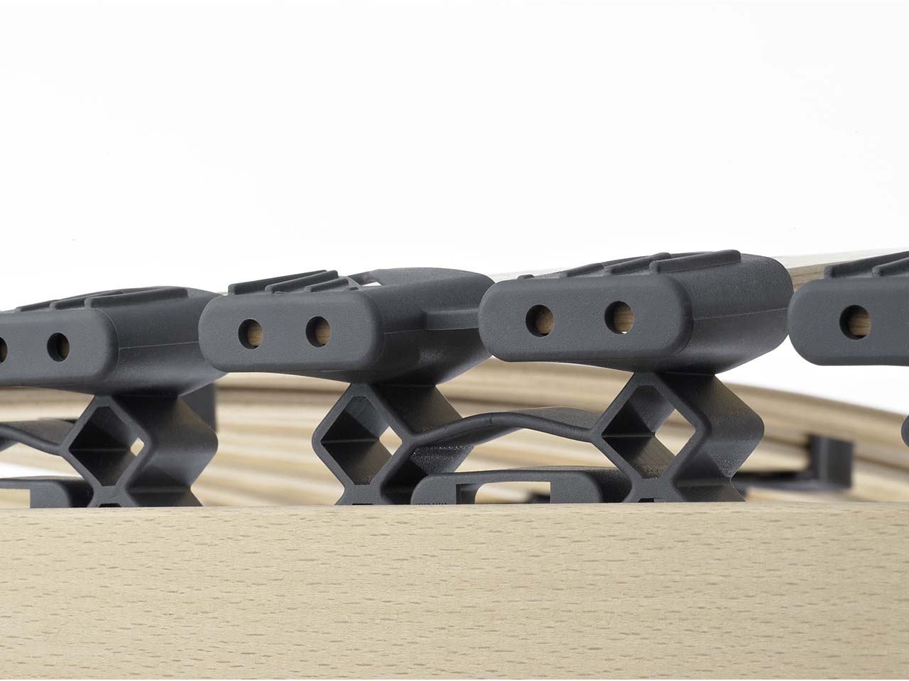 Der Lattenrost hat 28 Federleisten, die sich perfekt den Körperformen anpassen. Die Leisten geben an den passenden Stellen nach und sorgen dafür, dass die Matratze gut belüftet wird. Zum Schutz sind die Federleisten des Lattenrosts mit Doppelkappen aus Kautschuk geschützt. Durch die komplette Unterfederung bis an den Rand kann der Lattenrost auch sehr gut in einem Doppelbett verwendet werden. Sie erhalten auf den Lattenrost fünf Jahre Garantie.