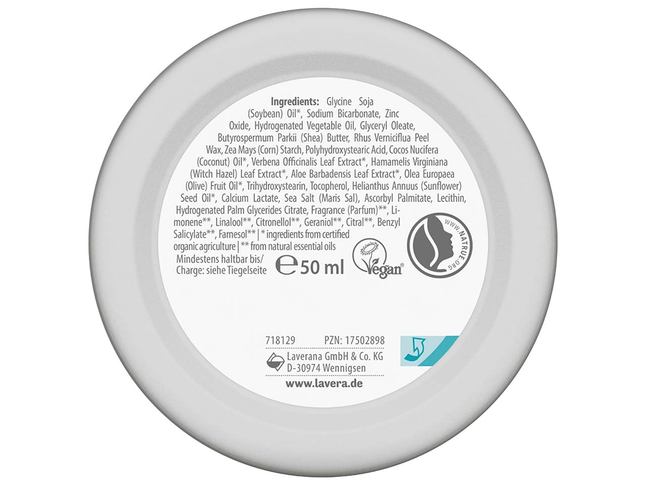Glycine Soja (Soybean) Oil*, Sodium Bicarbonate, Zinc Oxide, Hydrogenated Vegetable Oil, Glyceryl Oleate, Butyrospermum Parkii (Shea) Butter, Rhus Verniciflua Peel Wax, Zea Mays (Corn) Starch, Polyhydroxystearic Acid, Cocos Nucifera (Coconut) Oil*, Verbena Officinalis Leaf Extract*, Hamamelis Virginiana (Witch Hazel) Leaf Extract*, Aloe Barbadensis Leaf Extract*, Olea Europaea (Olive) Fruit Oil*, Trihydroxystearin, Tocopherol, Helianthus Annuus (Sunflower) Seed Oil*, Calcium Lactate, Sea Salt (Maris Sal), Ascorbyl Palmitate, Lecithin, Hydrogenated Palm Glycerides Citrate, Fragrance (Parfum)**, Limonene**, Linalool**, Citronellol**, Geraniol**, Citral**, Benzyl Salicylate**, Farnesol** * ingredients from certified organic agriculture ** from natural essential oils |