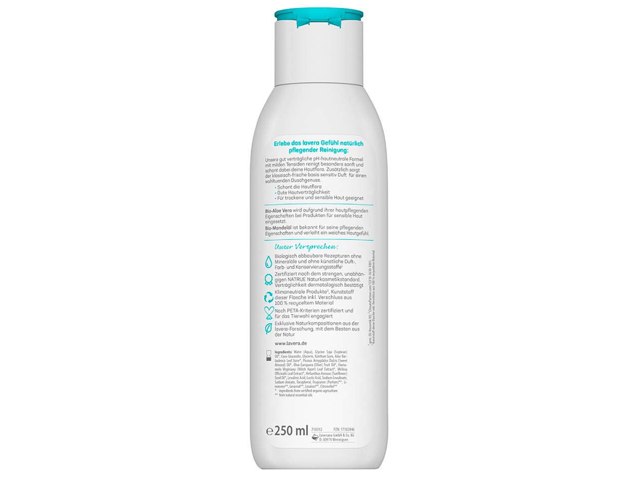 Klassisch-frischer Duft und schonende Hautpflege in Einem! Das Bio-Duschgel von lavera reinigt mit einer pH-neutralen Formel auf Basis von milden Tensiden und ist deshalb besonders sanft zur Haut. Damit ist die Cremedusche auch perfekt für Menschen mit trockener oder sensibler Haut! Die biologisch abbaubare Rezeptur enthält wertvolle Inhaltsstoffe aus kontrolliert biologischem Anbau. So überzeugt Bio-Aloe Vera mit hautpflegenden Eigenschaften und Bio-Mandelöl nährt und bewahrt die Feuchtigkeit. Dazu duftet das NATRUE-zertifizierte Duschgel angenehm frisch. Ideal, um gut in den Tag zu starten! Inhalt 250 ml.