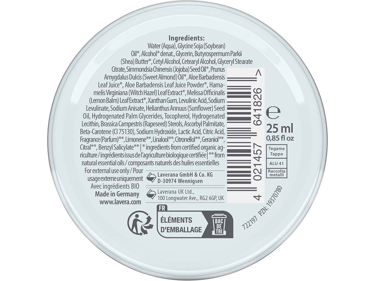 Water (Aqua), Glycine Soja (Soybean) Oil*, Alcohol* denat., Glycerin, Butyrospermum Parkii (Shea) Butter*, Cetyl Alcohol, Cetearyl Alcohol, Glyceryl Stearate Citrate, Simmondsia Chinensis (Jojoba) Seed Oil*, Prunus Amygdalus Dulcis (Sweet Almond) Oil*, Aloe Barbadensis Leaf Juice*, Aloe Barbadensis Leaf Juice Powder*, Hamamelis Virginiana (Witch Hazel) Leaf Extract*, Melissa Officinalis (Lemon Balm) Leaf Extract*, Xanthan Gum, Levulinic Acid, Sodium Levulinate, Sodium Anisate, Helianthus Annuus (Sunflower) Seed Oil, Hydrogenated Palm Glycerides, Tocopherol, Hydrogenated Lecithin, Brassica Campestris (Rapeseed) Sterols, Ascorbyl Palmitate, Beta-Carotene (CI 75130), Sodium Hydroxide, Lactic Acid, Citric Acid, Fragrance (Parfum)**, Limonene**, Linalool**, Citronellol**, Geraniol**, Citral**, Benzyl Salicylate** * ingredients from certified organic agriculture ** from natural essential oils |