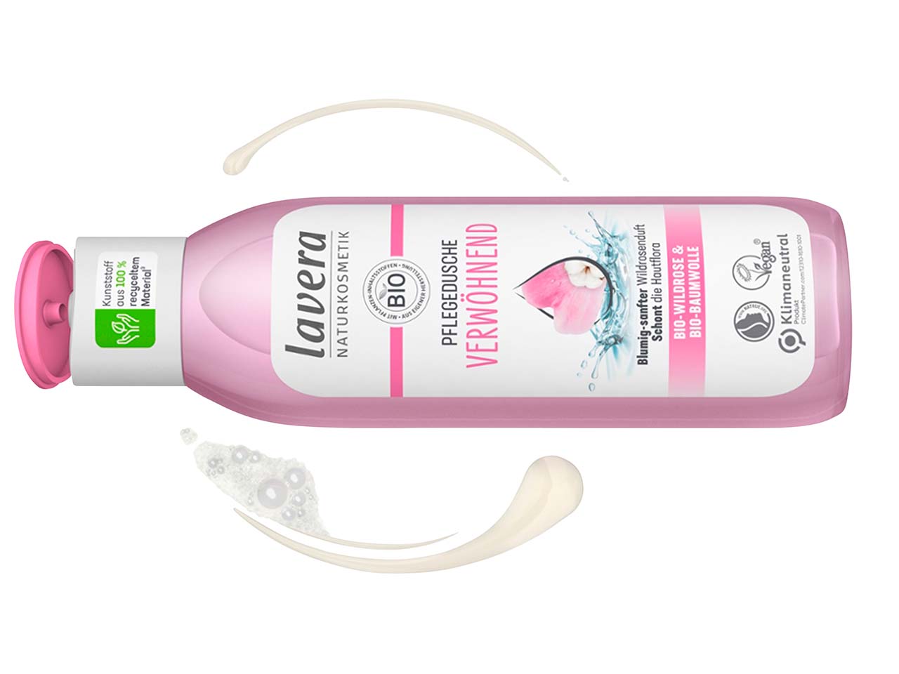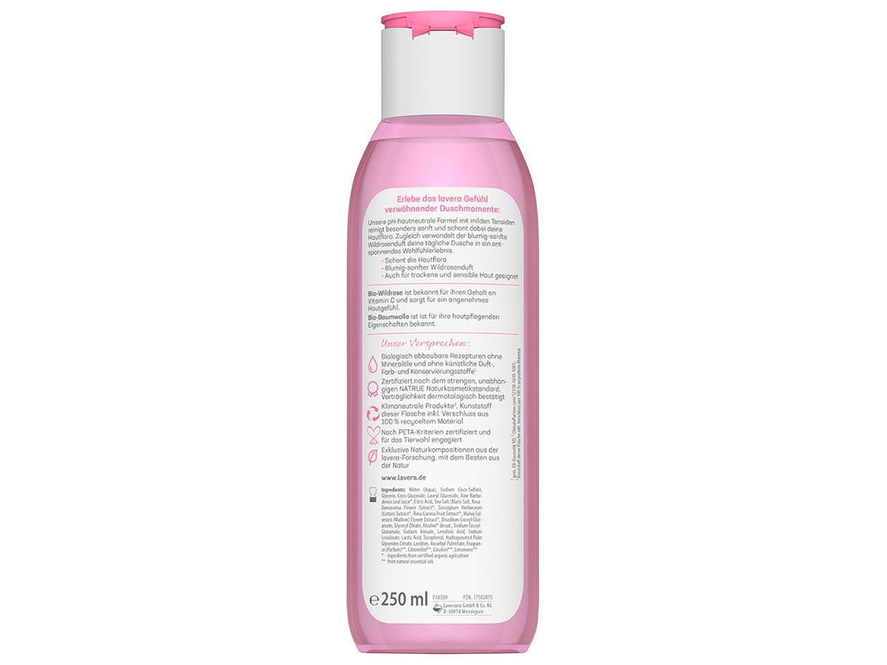 Wundervoller, blumig-zarter Duft und exzellente Pflege für die Haut vereinen sich in dieser Bio-Duschpflege von lavera. Die NATRUE-zertifizierte Naturkosmetik reinigt durch Bio-Wildrose, die ein angenehmes Hautgefühl hinterlässt, und Bio-Baumwolle, die mit ihren hautpflegenden Eigenschaften glänzt, besonders sanft. Die pH-neutrale Formel mit milden Tensiden ist auch für trockene und sensible Haut bestens geeignet. Inhalt 250 ml.