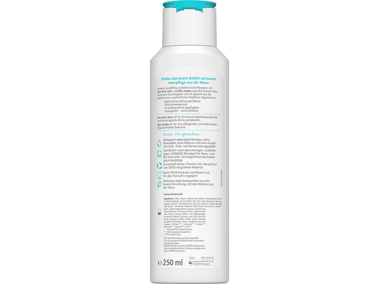 In diesem Shampoo von lavera sorgen Bio-Aloe Vera und Bio-Jojoba dafür, dass die Haare mit intensiver Feuchtigkeit versorgt werden. Die Haarpflege ist speziell auf die Bedürfnisse empfindlicher Kopfhaut abgestimmt und daher besonders mild. Die 100 % zertifizierte, vegane Naturkosmetik enthält Bio-Aloe Vera, die feuchtigkeitsspendend und beruhigend wirkt. Die nährenden Eigenschaften bringt Bio-Hafer ein. Das Shampoo für normales und trockenes Haar ist frei von Silikonen sowie künstlichen Duft-, Farb- und Konservierungsstoffen. Anwendung: Das Shampoo ins nasse Haar einmassieren und gut ausspülen. Inhalt 250 ml.