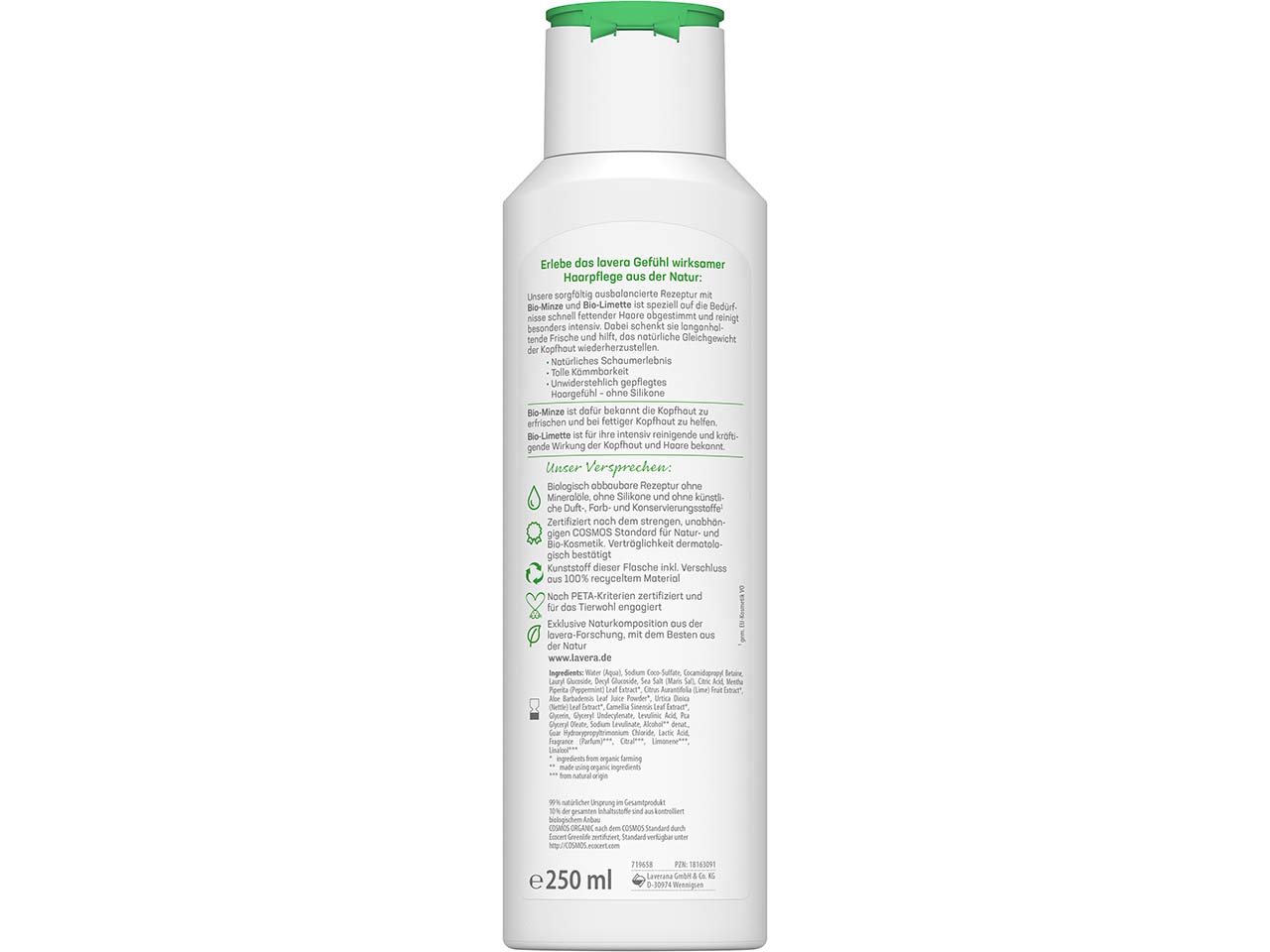 Das Pflegeshampoo von lavera ist speziell auf die besonderen Bedürfnisse von schnell fettenden Haaren abgestimmt. Die Rezeptur ist dafür sorgfältig ausbalanciert und reinigt intensiv. Die Kombination aus Bio-Minze und Bio-Limette sorgt für langanhaltende Frische und hilft, das natürliche Gleichgewicht der Kopfhaut wiederherzustellen. Bio-Minze übernimmt die Aufgabe, die Kopfhaut zu erfrischen. Limette ist dafür bekannt, intensiv zu reinigen und die Haare zu kräftigen. Silikone sowie künstliche Duft-, Farb- und Konservierungsstoffe kommen im Shampoo nicht vor. Anwendung: Das Shampoo in das nasse Haar einmassieren und gründlich mit Wasser ausspülen. Inhalt 250 ml.