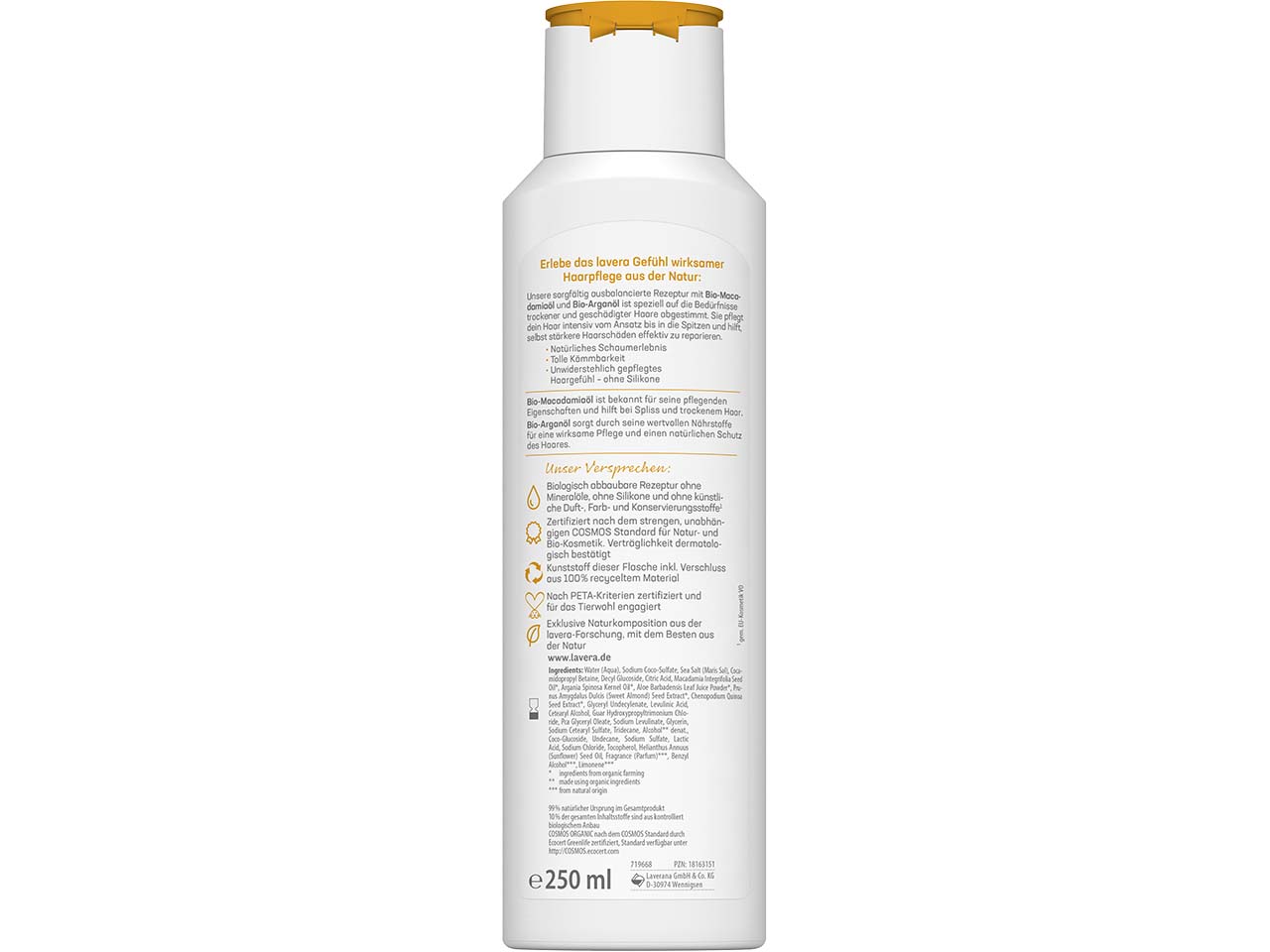 Intensive Reparatur und reichhaltige Pflege schenkt dieses lavera Pflegeshampoo trockenem und geschädigtem Haar. Die Haare werden vom Ansatz bis in die Spitzen intensiv gepflegt. Dafür sorgt das Bio-Macadamiaöl, das vor allem bei Spliss und trockenem Haar hilft. Bio-Arganöl pflegt die Haare mit wertvollen Nährstoffen und sorgt für natürlichen Schutz. Die vegane Naturkosmetik hilft dabei, selbst stärkere Haarschäden zu reparieren. Anwendung: Das Shampoo in das nasse Haar einmassieren und gründlich mit Wasser ausspülen. Inhalt 250 ml.