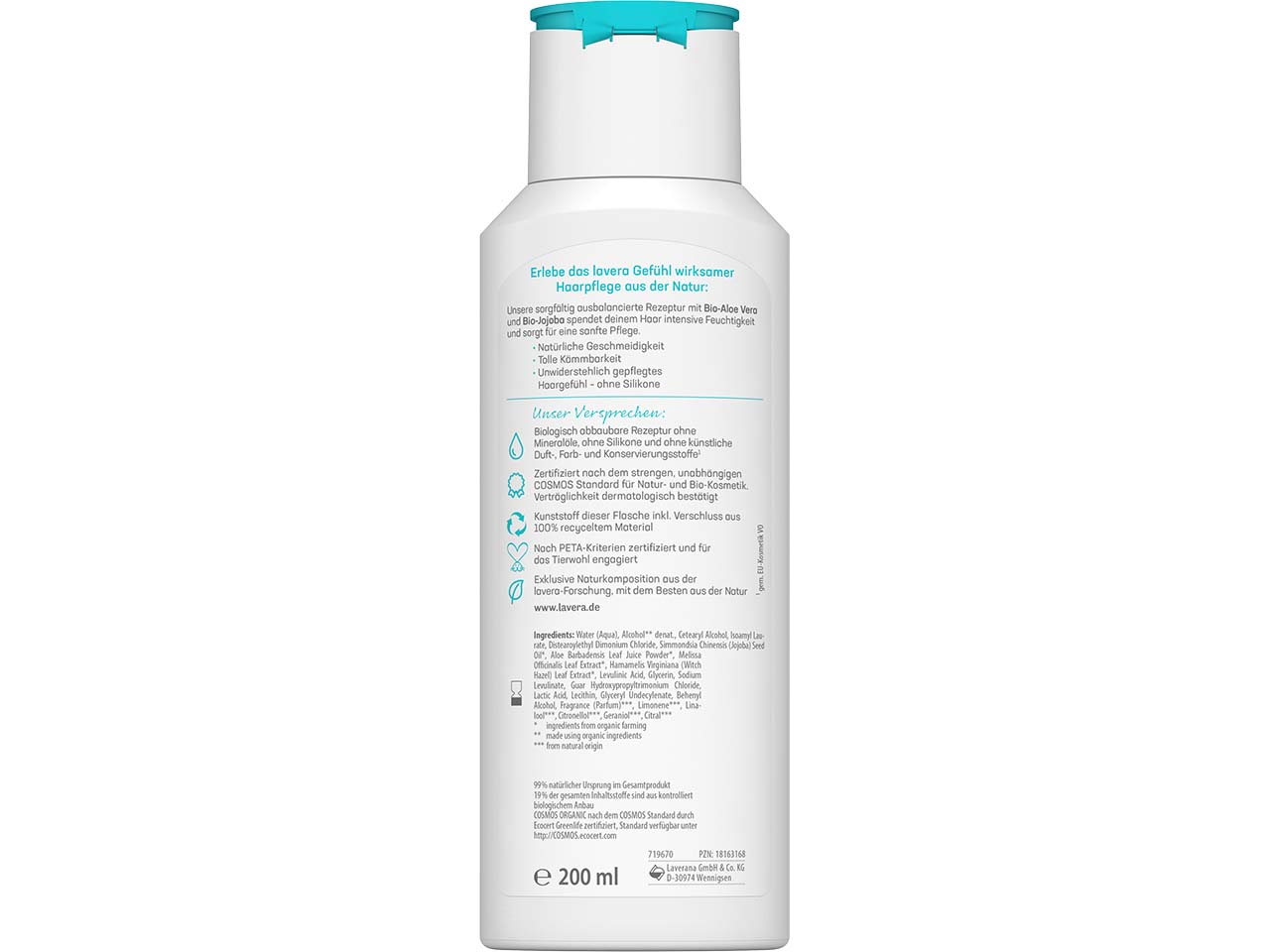 Die Pflegespülung von lavera verwöhnt die Haare mit intensiver Feuchtigkeit und sanfter Pflege. Die Hauptinhaltsstoffe der veganen Naturkosmetik sind Bio-Aloe Vera und Bio-Jojoba. Vor allem Aloe Vera ist für ihre feuchtigkeitsspendende und beruhigende Wirkung bekannt. Jojoba wirkt mit pflegenden und nährenden Eigenschaften. Die Pflegespülung verleiht dem Haar natürliche Geschmeidigkeit und macht es besser kämmbar – und das ganz ohne Silikone. Anwendung: Nach der Haarwäsche in die Spitzen und Längen einmassieren und gut ausspülen. Inhalt 200 ml.