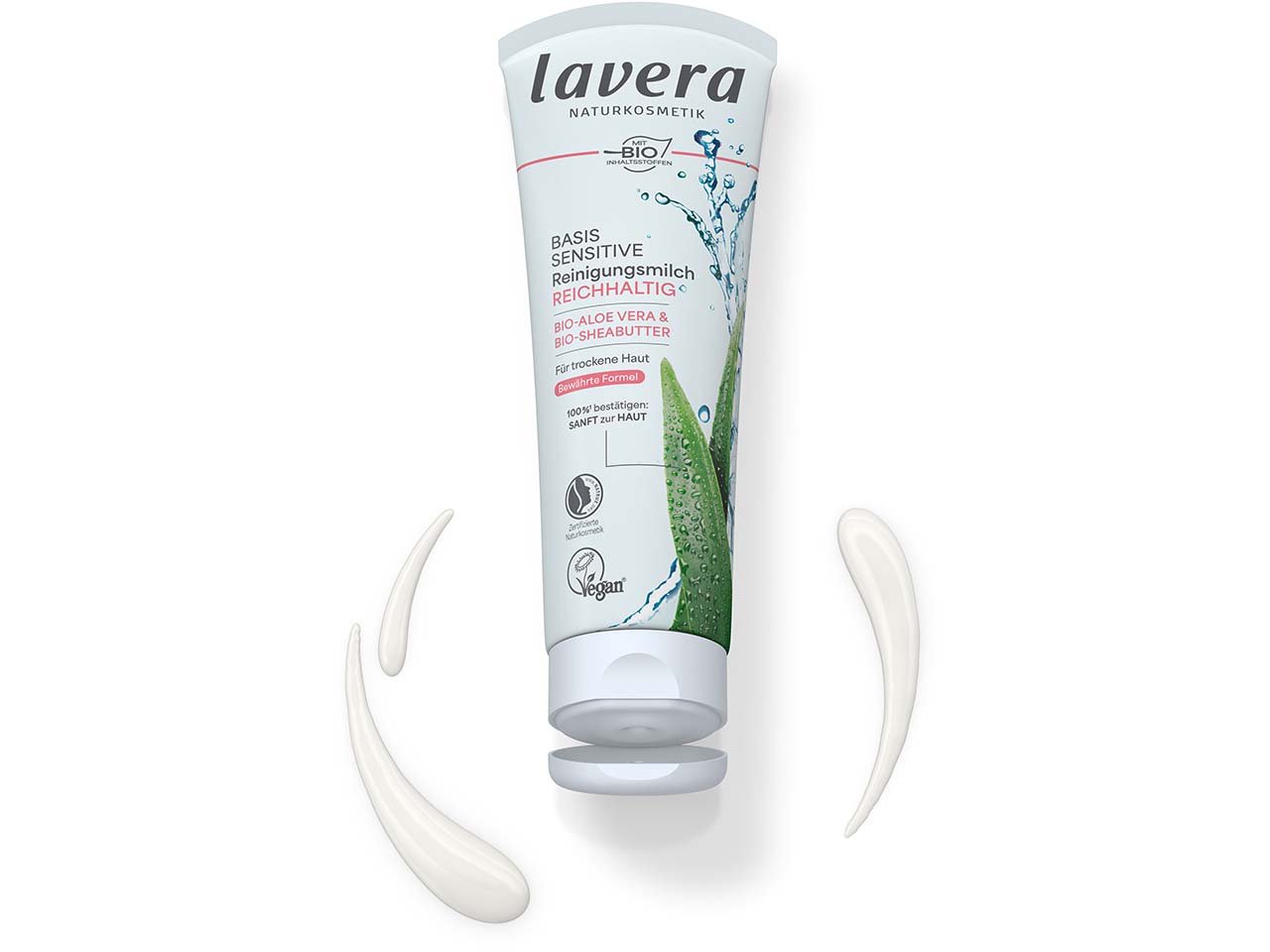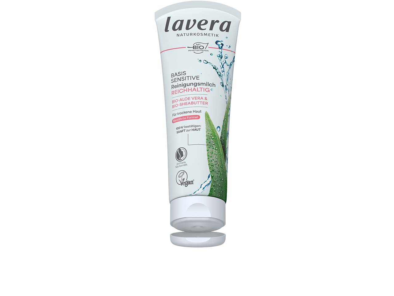 Die NATRUE-zertifizierte Reinigungsmilch von lavera schenkt der Haut intensive Feuchtigkeit. Sie ist für jeden Hauttyp geeignet und enthält hochwertige Inhaltsstoffe wie feuchtigkeitsspendende Bio-Aloe Vera, Bio-Sheabutter und Vitamin E. Die Haut wird schonend gereinigt und fühlt sich danach zart gepflegt an. Die Reinigungsmilch eignet sich, um Augen-Make-up zu entfernen.