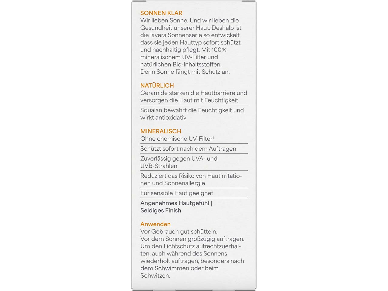 | Anwendungshinweis: | Vor Gebrauch gut schütteln. Vor dem Sonnen großzügig auftragen. Um den Lichtschutz aufrechtzuerhalten, auch während des Sonnens wiederholt auftragen, besonders nach dem Schwimmen oder beim Schwitzen. Intensive Mittagssonne meiden. Geringe Auftragsmengen reduzieren die Schutzleistung. Babys und Kleinkinder vor direkter Sonne bewahren, schützende Kleidung sowie Sonnenschutz mit hohem Lichtschutzfaktor (LSF größer als 25) verwenden. Auch Sonnenschutzmittel mit hohem LSF bieten keinen vollständigen Schutz vor UV-Strahlen. Übermäßiges Sonnen stellt ein ernsthaftes Gesundheitsrisiko dar! Augenkontakt meiden. Kontakt mit Textilien meiden (Flecken möglich). Lippenbereich aussparen. Durch die Lichtreflexion der mineralischen Pigmente kann ein sichtbarer Schimmer auf der Haut entstehen. |