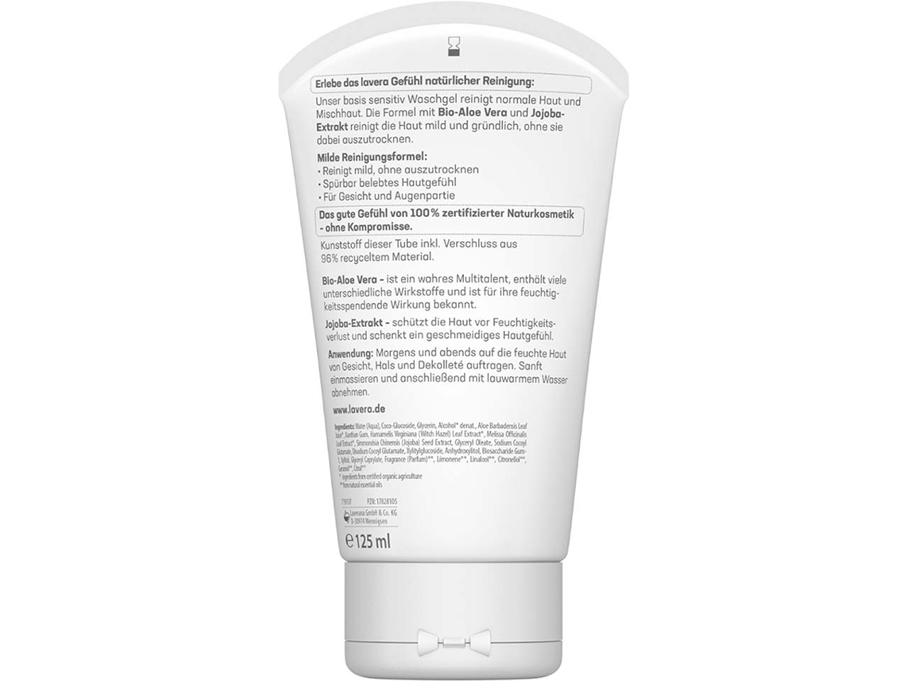 Das Bio-Waschgel von lavera reinigt normale und Mischhaut mit milder Formel! Die NATRUE-zertifizierte Pflege ist speziell zur Reinigung der Gesichts- und Augenpartie entwickelt. Das Waschgel ist frei von künstlichen Duft-, Farb- und Konservierungsstoffen und enthält dafür hochwertige Inhaltsstoffe wie Bio-Aloe Vera und Bio-Jojobaöl. Die Haut erhält so viel Feuchtigkeit und fühlt sich spürbar belebt an. Anwendung: Morgens und abends auf die feuchte Haut von Gesicht, Hals und Dekolleté auftragen, sanft einmassieren und mit lauwarmem Wasser abwaschen. Inhalt 125 ml.