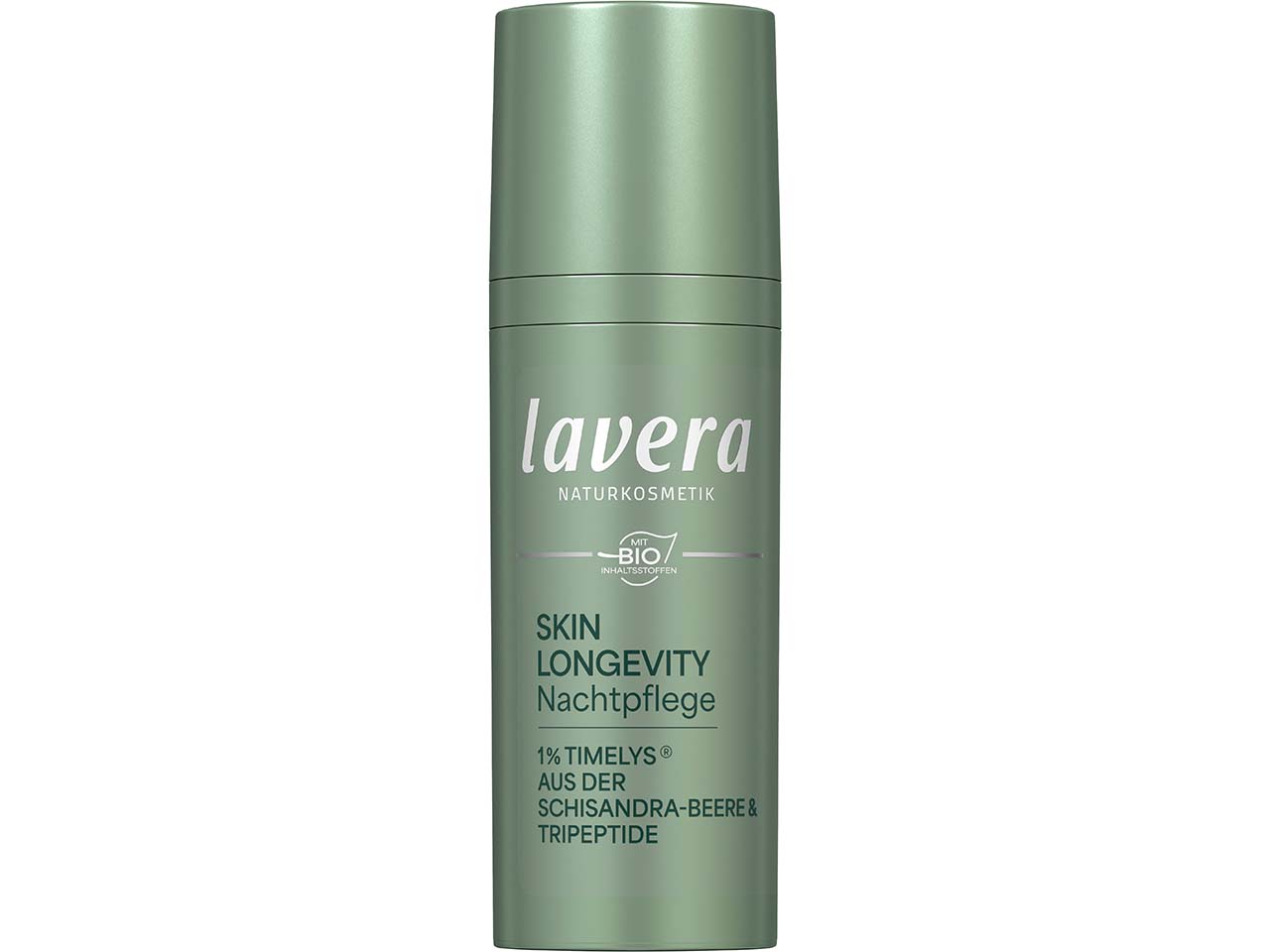 Die lavera Skin Longevity Nachtpflege folgt dem Slow-Ageing-Ansatz und unterstützt die Hautregeneration über Nacht. Die Formel mit 1 % Timelys® aus Schisandra-Beeren, Tripeptiden und einem NAD+ Booster (liposomal verkapseltes NMN) aktiviert zelluläre Reparaturprozesse, fördert die Kollagensynthese und verbessert die Elastizität. Sie unterstützt die natürliche Regeneration, stärkt die Hautbarriere und trägt dazu bei, Falten, Elastizitätsverlust und erste Zeichen der Hautalterung zu reduzieren.