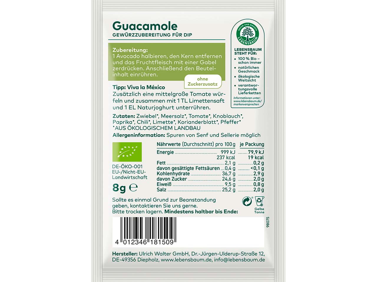Guacamole ist nicht nur in der mexikanischen Küche unglaublich beliebt! Um den Dip Zuhause zuzubereiten, ist diese Bio-Gewürzmischung von LEBENSBAUM perfekt. Hochwertige Zutaten aus kontrolliert biologischem Anbau wie Knoblauch, Limette, Tomate und scharfer Chili geben der Mischung ihren köstlichen Geschmack. Zur Zubereitung erst eine Avocado halbieren, Kern entfernen und das Fruchtfleisch mit einer Gabel zerdrücken. Danach nur noch den Beutelinhalt einrühren und schon kann die Guacamole mit Tacos, Wraps, Gemüse oder Chips genossen werden! Inhalt 8 g.