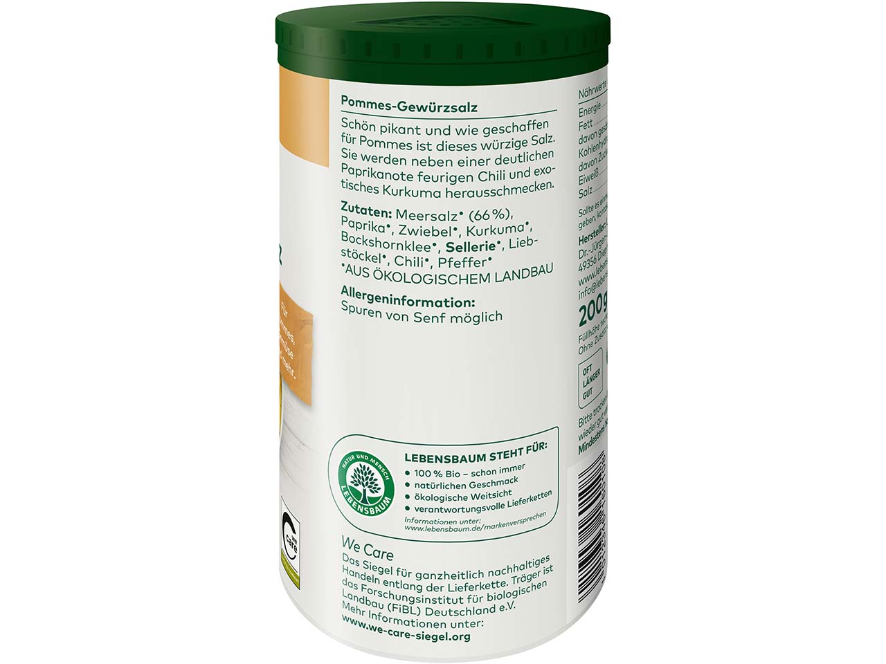 Würzig und mit einer Prise Feuer: Die Gewürzmischung von LEBENSBAUM verleiht nicht nur Pommes ein pikantes Aroma, sondern auch Gemüse, Hähnchen und mehr. Die Zutaten stammen aus kontrolliert biologischem Anbau. Enthalten sind z.B. Paprika, Zwiebel, Kurkuma, Chili und Pfeffer. Das Pommes-Gewürzsalz ist eine perfekte Ergänzung zu Ketchup, Mayonnaise und Co.