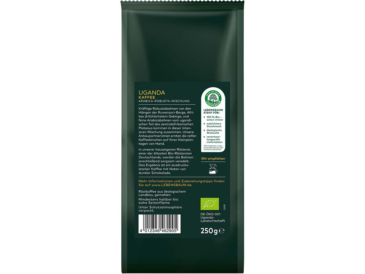 Noten von dunkler Schokolade verleihen diesem intensiven Bio-Kaffee sein ganz besonderes Aroma. Der gemahlene Kaffee aus kontrolliert biologischem Anbau enthält einen Blend aus Robusta- und Arbicabohnen. Die reifen Kaffeekirschen werden in den Hängen der Ruwenzori-Berge und in dem ugandischen Teil des zentralafrikanischen Plateaus von Hand geerntet. In der hauseigenen LEBENSBAUM Rösterei werden sie dann zur Perfektion veredelt. Der Bio-Kaffee eignet sich zur Zubereitung im Handfilter und der Kaffeemaschine.