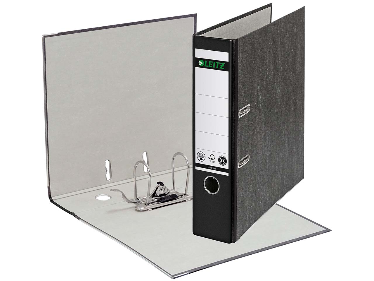 Original Leitz Ordner mit 180°-Präzisionsmechanik für beidseitiges Abheften. Ordnerkern aus stabiler Recyclingpappe. Mit Metallkantenschutz, Griffloch und Raumsparschlitzen. Für Format DIN A4. T 28,5 x H 32 cm. Rückenbreite 8 cm. Rückenfarbe schwarz.