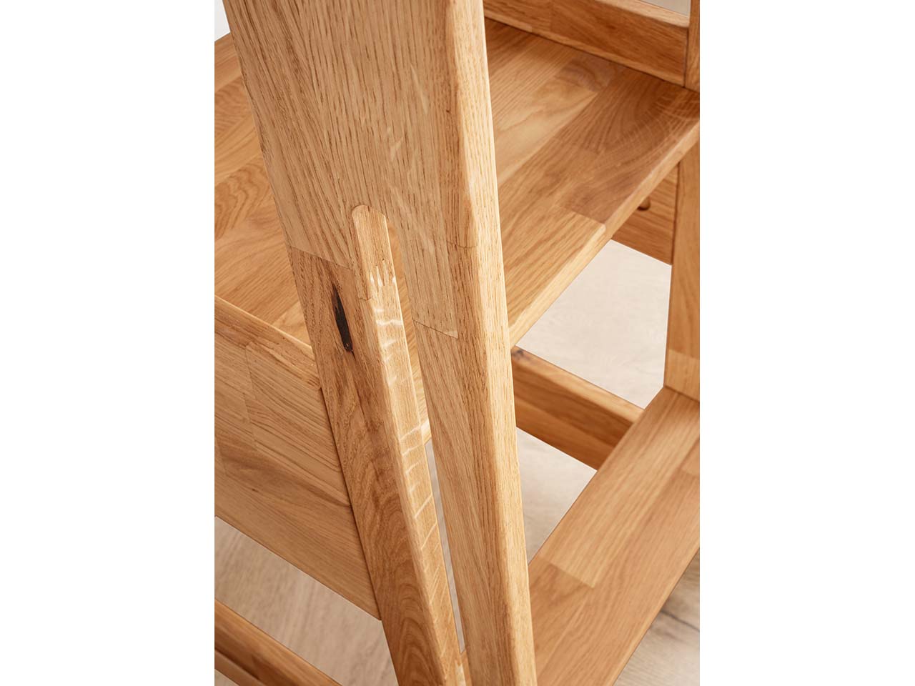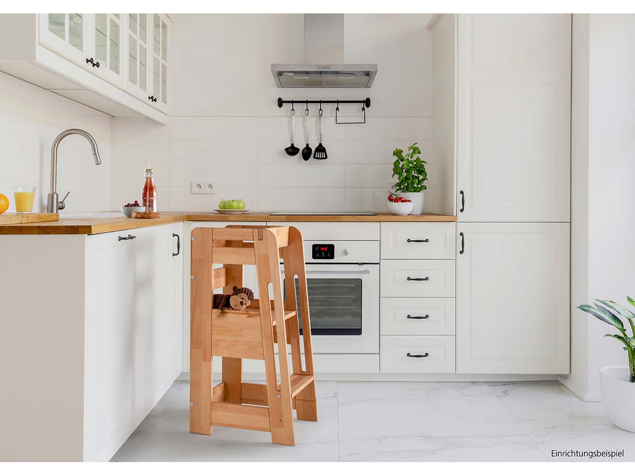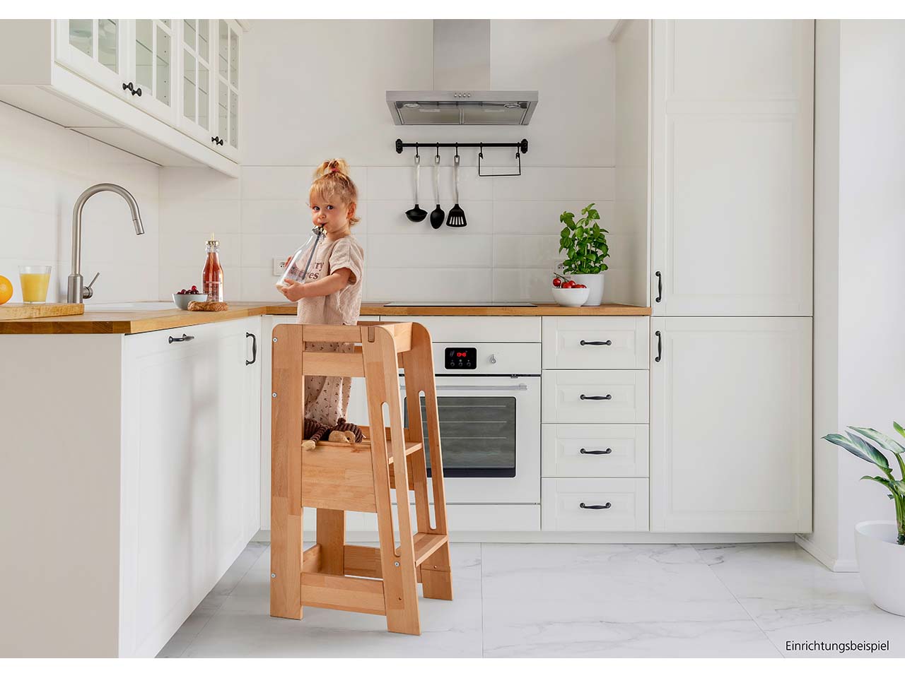 Damit Kinder immer auf Augenhöhe und im Alltag mit dabei sind: Der Lernturm ist perfekt, damit selbst die Kleinsten ab 12 Monaten beim Kochen, Backen und Co. mithelfen können! Der Turm nach Montessori-Prinzip kann helfen, das Selbstbewusstsein zu stärken. Kinder können durch die Höhe viel selbst machen, z.B. Hände waschen oder Zähne putzen. Der Lernturm wächst dabei mit: Stufe und Stehfläche können auf zwei Höhen angebracht werden. Ist das Kind größer, kann der Lernturm auch zum Hochstuhl umgewandelt werden. Er lässt sich alternativ auch als Beistell- oder Nachttisch verwenden. Ein echter Allrounder, der einmal angeschafft ganz lange im Leben von Familien bleibt. Abgerundete Ecken und die Absturzsicherung machen die Nutzung des Lernturms sicher. Erhältlich aus Wildeiche, Buche oder Buche weiß. B 42 x T 52 x H 89 cm.