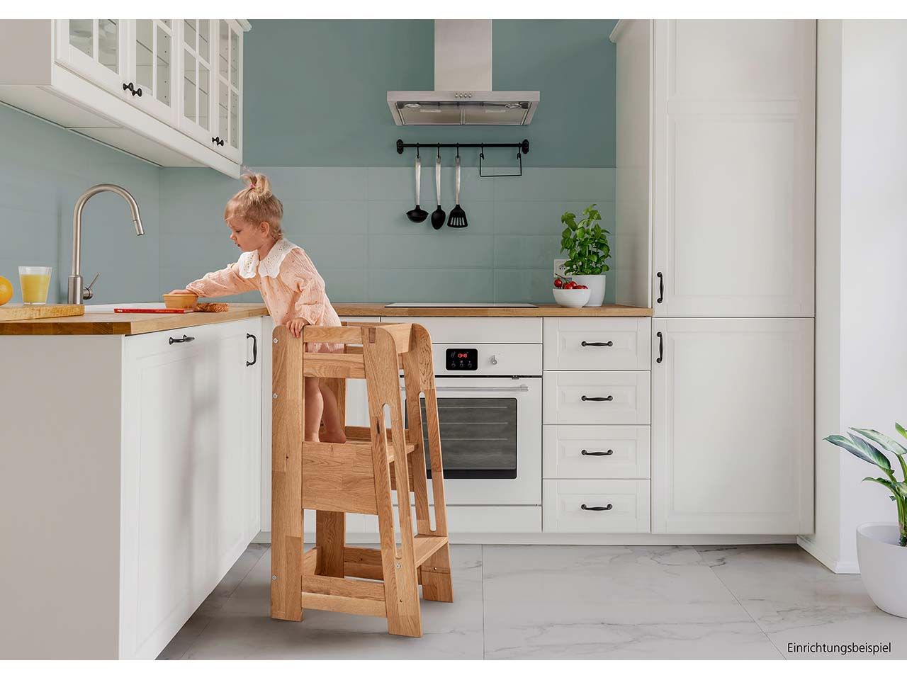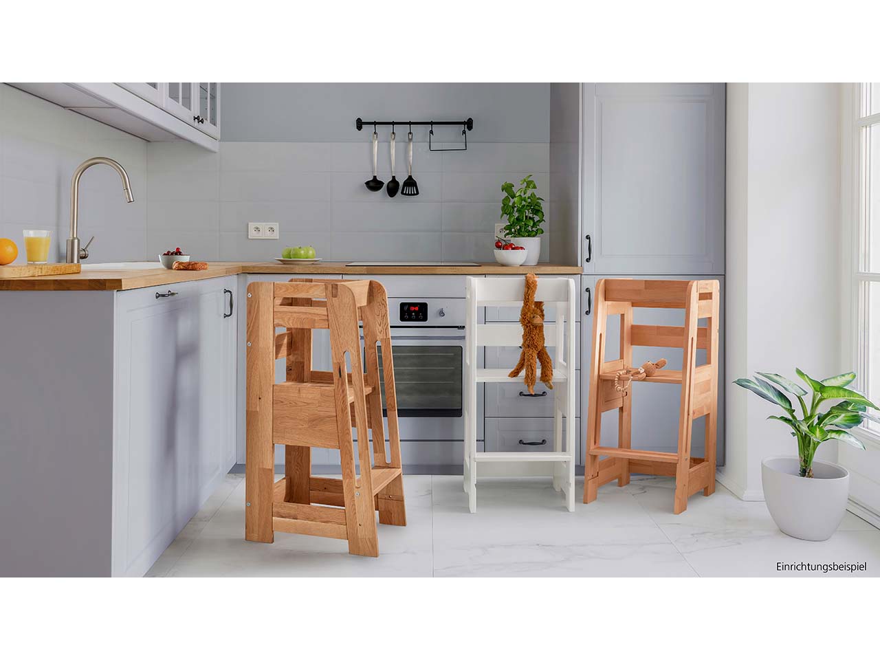 Damit Kinder immer auf Augenhöhe und im Alltag mit dabei sind: Der Lernturm ist perfekt, damit selbst die Kleinsten ab 12 Monaten beim Kochen, Backen und Co. mithelfen können! Der Turm nach Montessori-Prinzip kann helfen, das Selbstbewusstsein zu stärken. Kinder können durch die Höhe viel selbst machen, z.B. Hände waschen oder Zähne putzen. Der Lernturm wächst dabei mit: Stufe und Stehfläche können auf zwei Höhen angebracht werden. Ist das Kind größer, kann der Lernturm auch zum Hochstuhl umgewandelt werden. Er lässt sich alternativ auch als Beistell- oder Nachttisch verwenden. Ein echter Allrounder, der einmal angeschafft ganz lange im Leben von Familien bleibt. Abgerundete Ecken und die Absturzsicherung machen die Nutzung des Lernturms sicher. Erhältlich aus Wildeiche, Buche oder Buche weiß. B 42 x T 52 x H 89 cm.