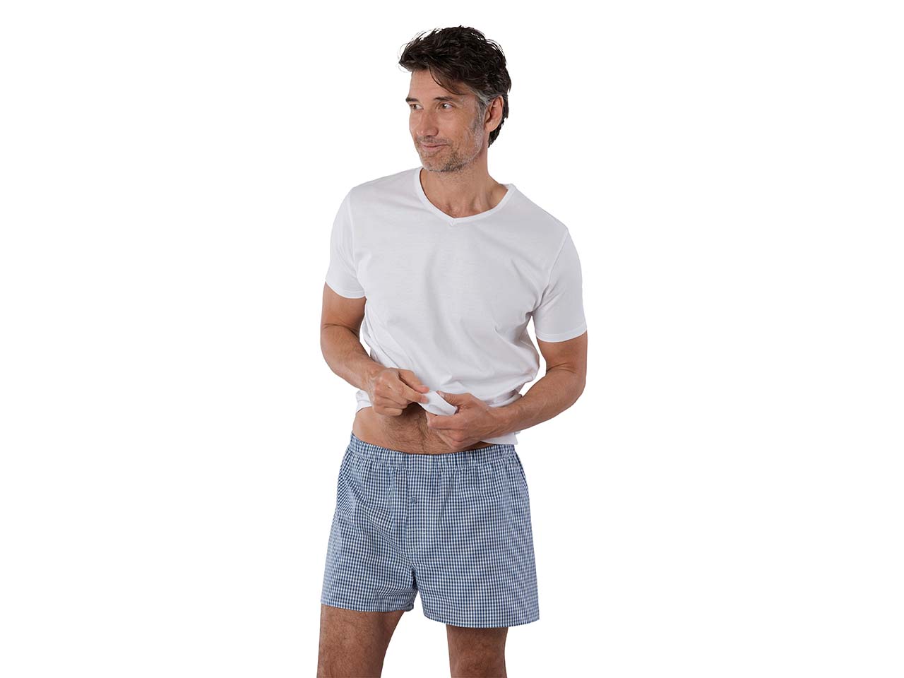 Die Herren-Boxershorts sind ideal für Männer, die es etwas luftiger mögen. Sie sind bequem und locker geschnitten. Der komfortable Bund und das weite Bein runden den hohen Tragekomfort ab. Die Shorts aus Bio-Baumwolle in fein gewebter Qualität haben einen Eingriff und eine schmale Knopfleiste. Der praktische 2er-Pack besteht aus einer karierten und einer gestreiften Boxershorts.
