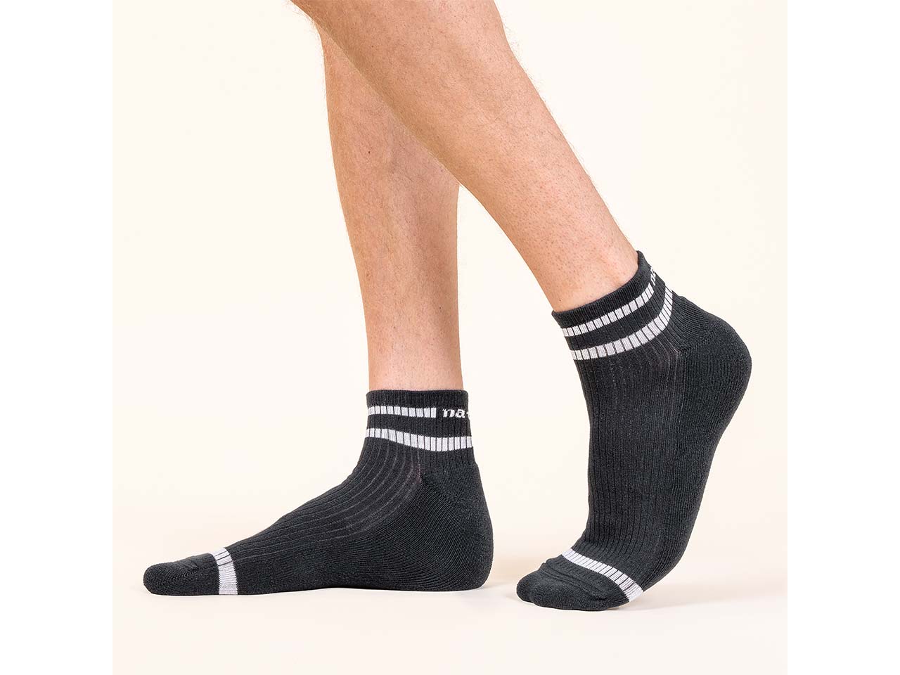 In diesen Socken kann man sich rundum wohlfühlen! Das sportliche Design ist nicht zufällig gewählt: Die Strümpfe mit erhöhtem Schaft eignen sich hervorragend, um sie zum Sport zu tragen. Der hochwertige Materialmix aus GOTS-zertifizierter Bio-Baumwolle, einem geringen Anteil Elasthan und etwas Polyamid gewährleistet höchsten Tragekomfort. Die weiche Plüschsohle rundet die Sneaker-Socken perfekt ab.