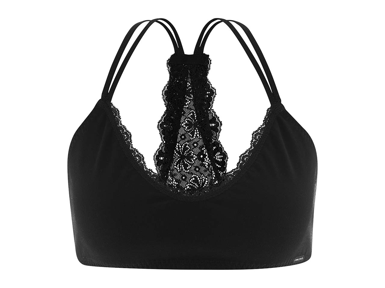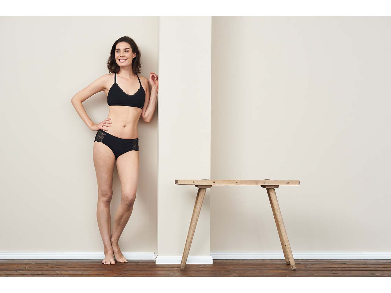 Eine gelungene Mischung aus bequem und verführerisch ist das Damen-Bustier. Bequeme Bio-Baumwolle wird hier mit einer schmalen Spitzenborte am Ausschnitt und weicher Spitze aus 84 % Polyamid und 16 % Elasthan am Rücken kombiniert. Die schmalen Doppelträger dürfen auch schon mal unter einem weiten Oberteil hervorblitzen.