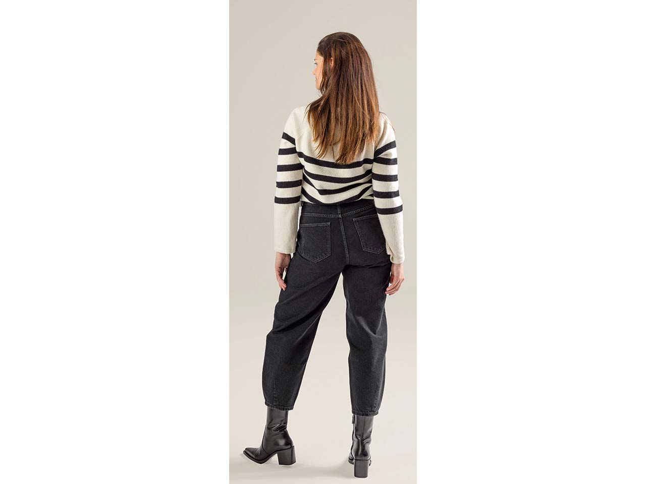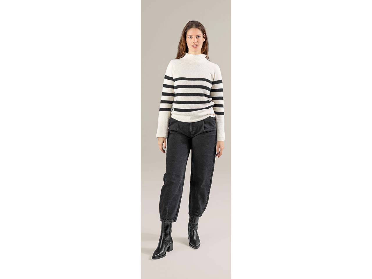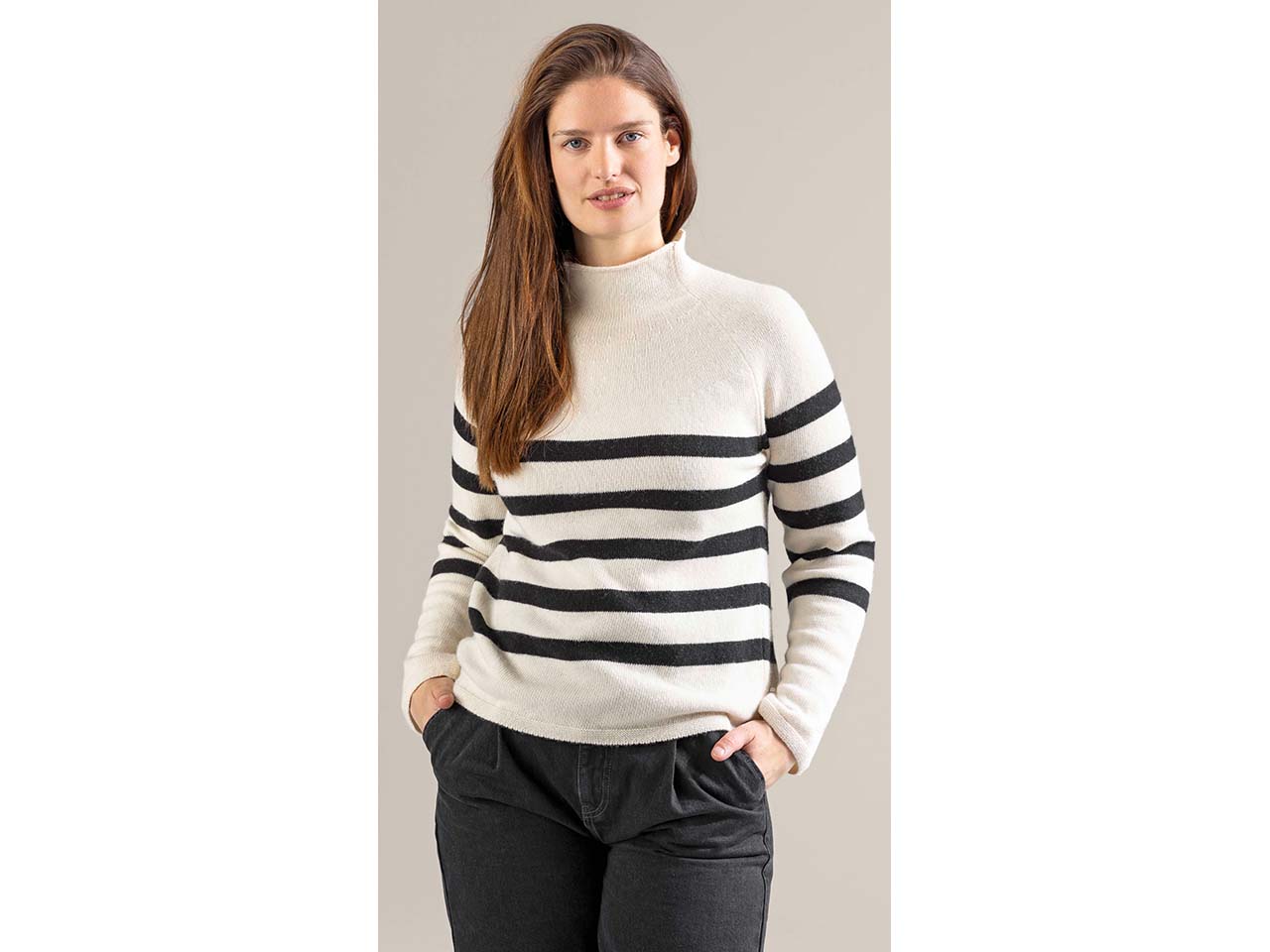 Ein Pullover, in dem man sich Tag für Tag wohlfühlen kann! Die Materialmischung aus Bio-Wolle und Bio-Baumwolle sorgt für kuschelig weiche Wärme. Das dichte, feine Gestrick fühlt sich wunderbar auf der Haut an. Dazu glänzt der Pullover mit klassischer Eleganz in Schwarz-Weiß. Die Streifenoptik macht das Oberteil zu einem Allrounder, an dem man lange Freude hat. Der hohe Kragen ist ein modisches Highlight und schützt den empfindlichen Halsbereich besonders an kalten und windigen Tagen.
