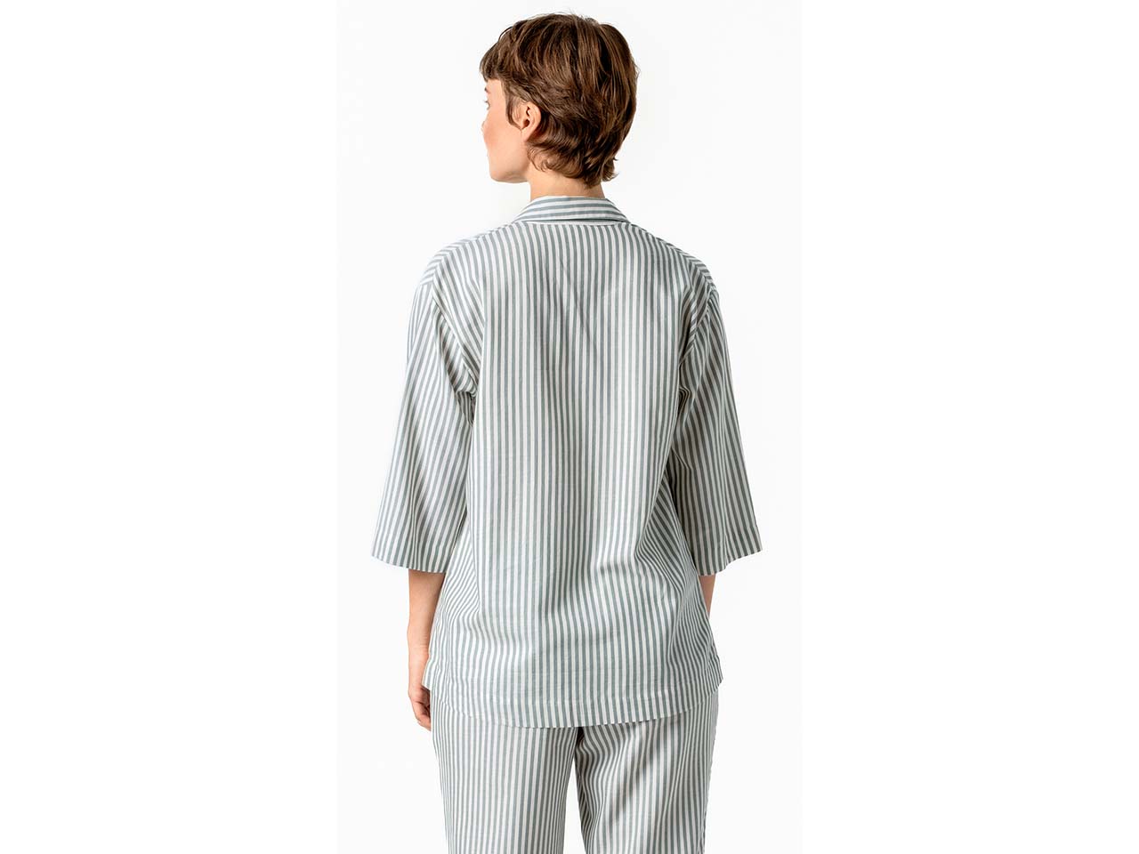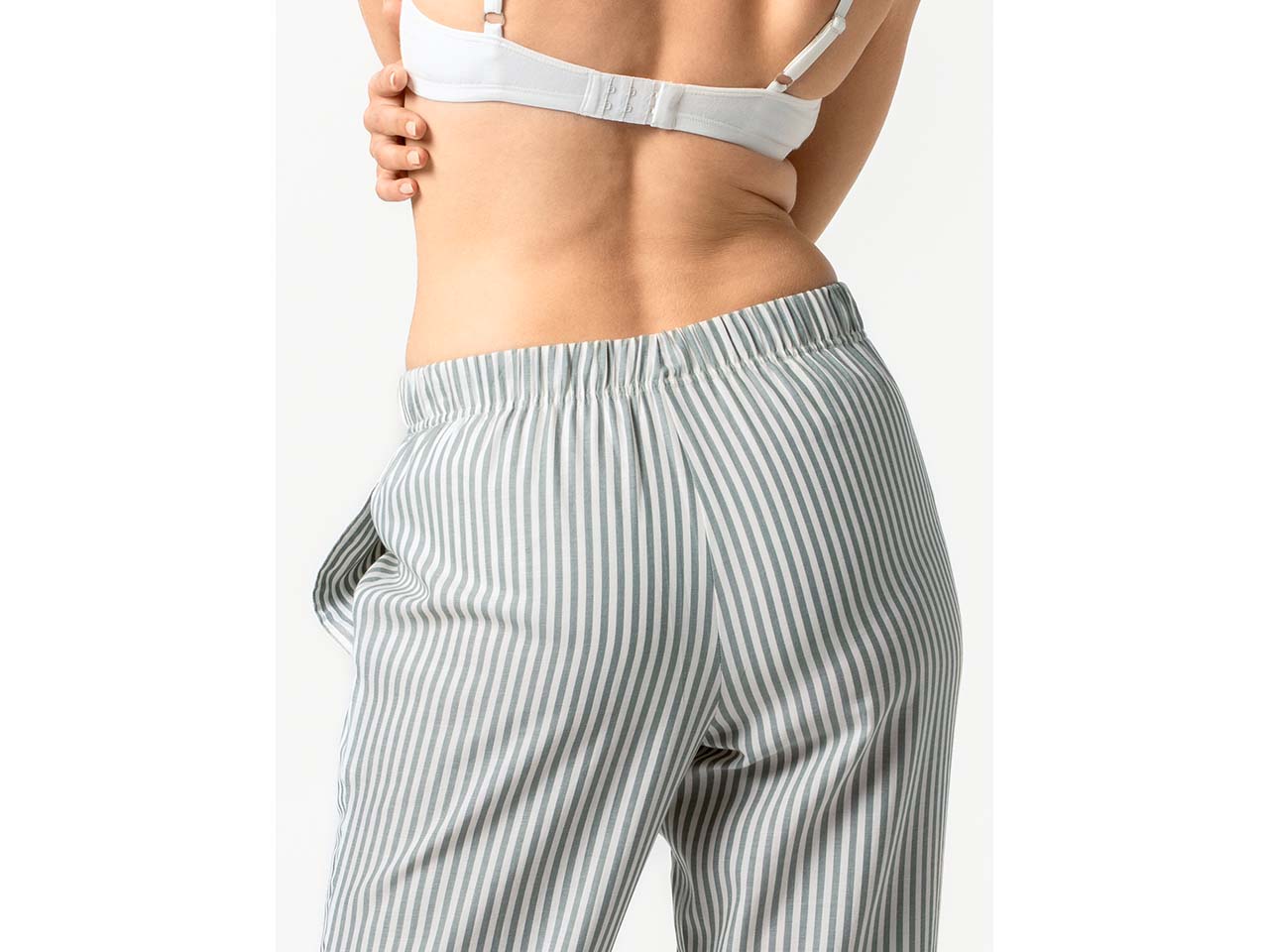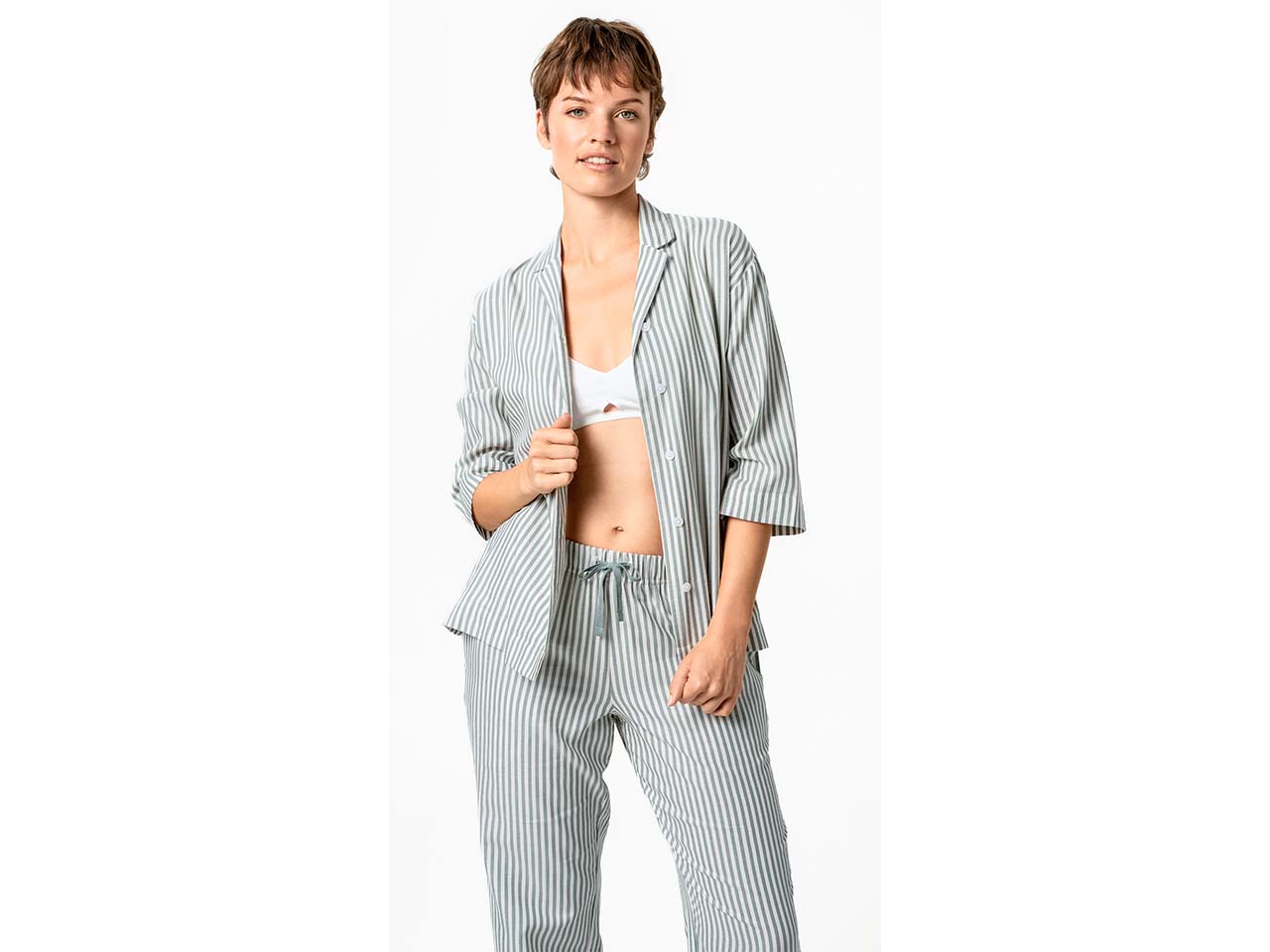 Dieses Pyjama-Set sorgt für traumhaft guten Tragekomfort! Die Schlafanzughose mit geradem Bein sitzt dank elastischem Hosenbund perfekt am Körper. Das Oberteil sieht mit 3/4-Arm und Reverskragen besonders modern aus. Für einen hohen Tragekomfort sorgt die GOTS-zertifizierte Bio-Baumwolle. Die garngefärbten Streifen geben dem Pyjama sein modisches Aussehen.