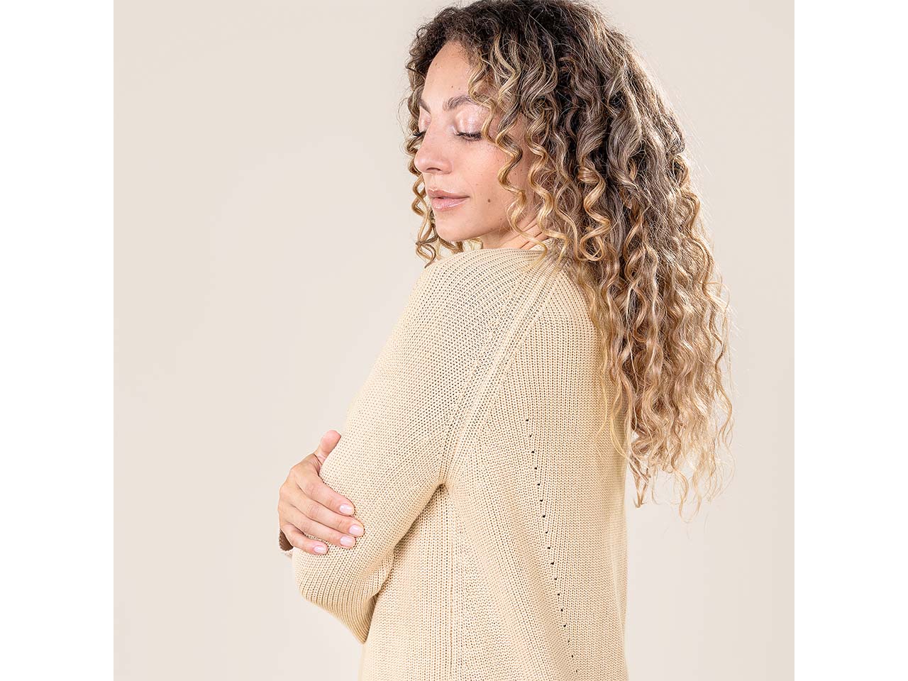 Wenn es mal etwas kühler ist und man sich nach Wärme sehnt, ist diese Strickjacke die perfekte Lösung. Das modische Accessoire aus GOTS-zertifizierter Bio-Baumwolle ist angenehm weich und ideal, um sich einzukuscheln. Die weiten Ärmel im Raglan-Stil sind genau so ein Highlight wie der Verzicht auf eine Knopfleiste. Dadurch ermöglichen sich viele verschiedene Tragemöglichkeiten. Die Strickjacke hat einen tiefgezogenen V-Ausschnitt und eine weite Schnittform, sodass man das Oberteil z.B. auch mit einem Pulli kombinieren kann.
