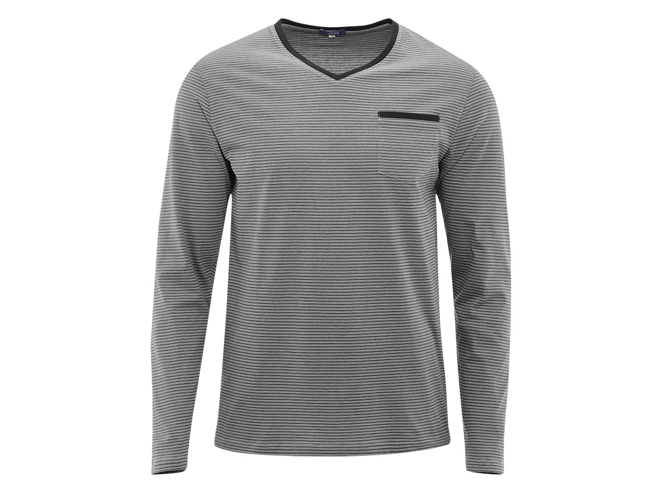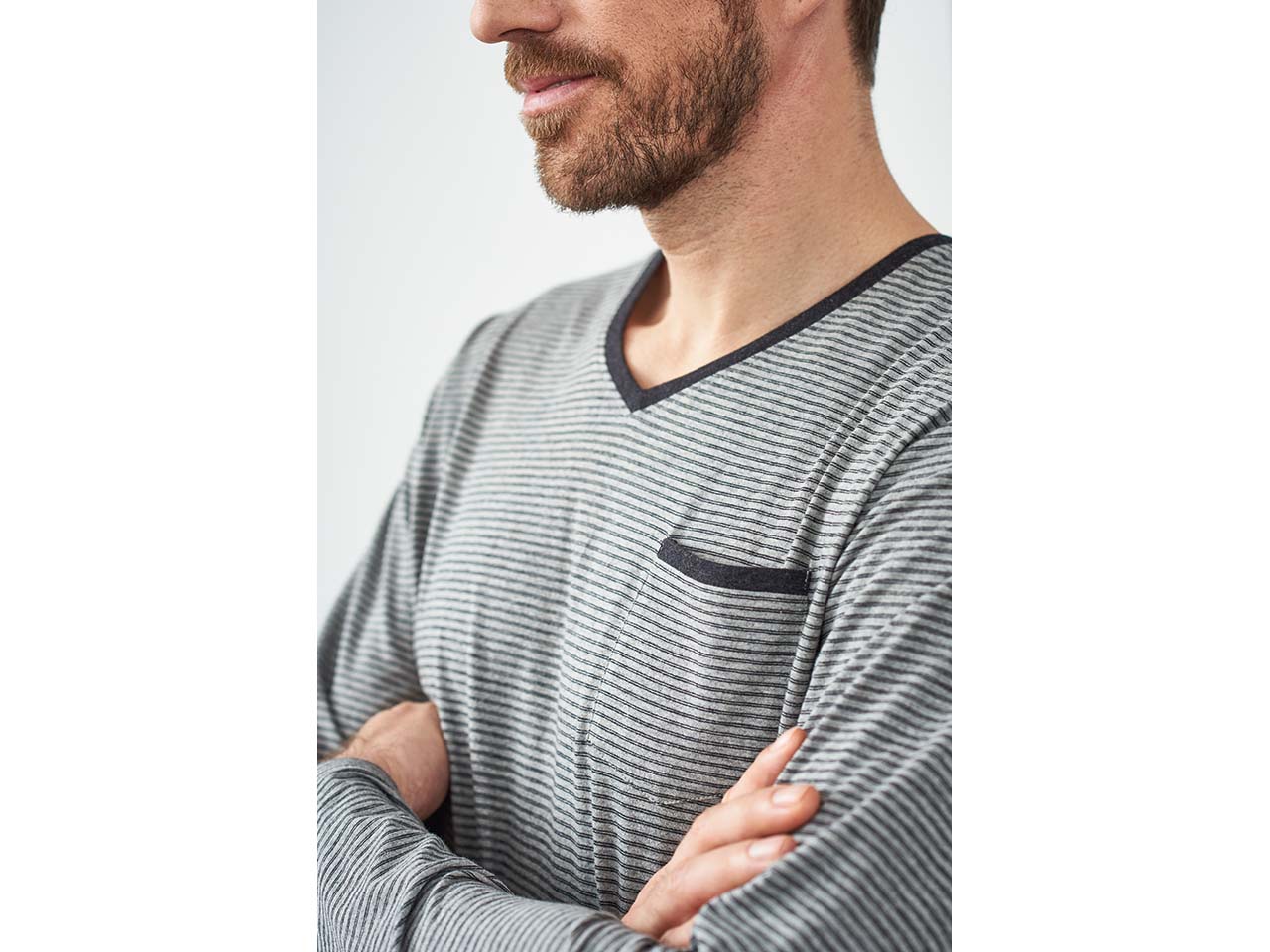 Ein Klassiker für die Nacht: Der lange Schlafanzug "Colin" für Herren fühlt sich dank Bio-Baumwolle in Single-Jersey-Qualität unglaublich weich auf der Haut an. Der Zweiteiler in zeitlosem Design besteht aus einem gestreiften Langarmshirt mit V-Ausschnitt und aufgesetzter Brutsttasche sowie einer langen unifarbenen Hose mit kontrastfarbenem Bindebändchen am Bund und breiten, bequemen Bündchen am Beinabschluss.