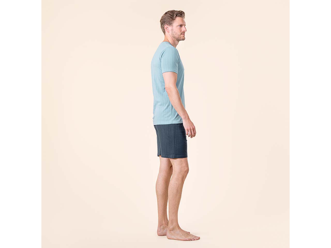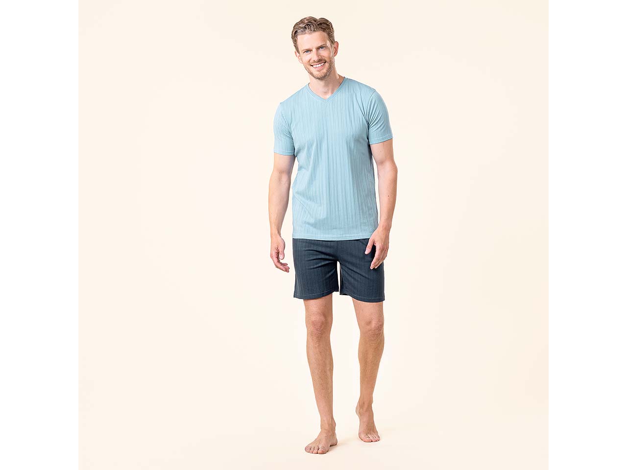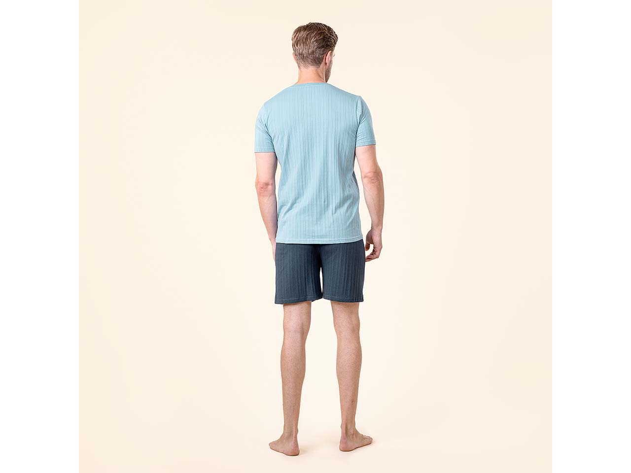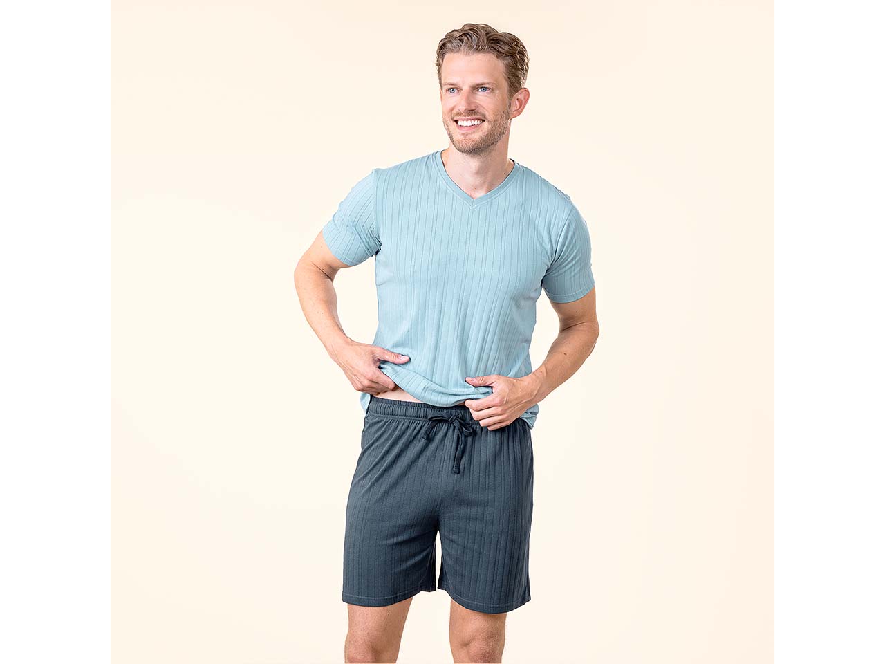 In diesem Schlafanzug schlafen Herren im Sommer richtig gut! Das leichte, elastische „Fancy Rib“-Material aus GOTS-zertifizierter Bio-Baumwolle und einem geringen Anteil aus Elasthan macht jede Bewegung mit und schmiegt sich weich an die Haut. Das kurzärmelige Shirt und die Shorts sind ideal als sommerlicher Pyjama. Die Shorts haben einen breiten, elastischen Bund und ein innenliegendes Bindeband, sodass ein individueller Sitz möglich ist.