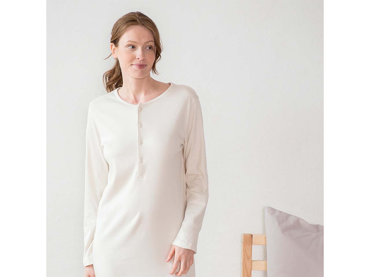 Klassisches Langarm-Nachthemd im zeitlosen Retro-Look! Höchster Tragekomfort entsteht durch die GOTS-zertifizierte Bio-Baumwolle in geschmeidiger Interlock-Jersey-Qualität, die sich angenehm weich auf der Haut anfühlt. Das Unisex-Nachthemd hat einen weiten Rundhalsausschnitt mit langer Vierknopfleiste, einen abgerundeten Saum mit Seitenschlitzen und Ärmelabschlüsse mit Doppelnahtsaum.