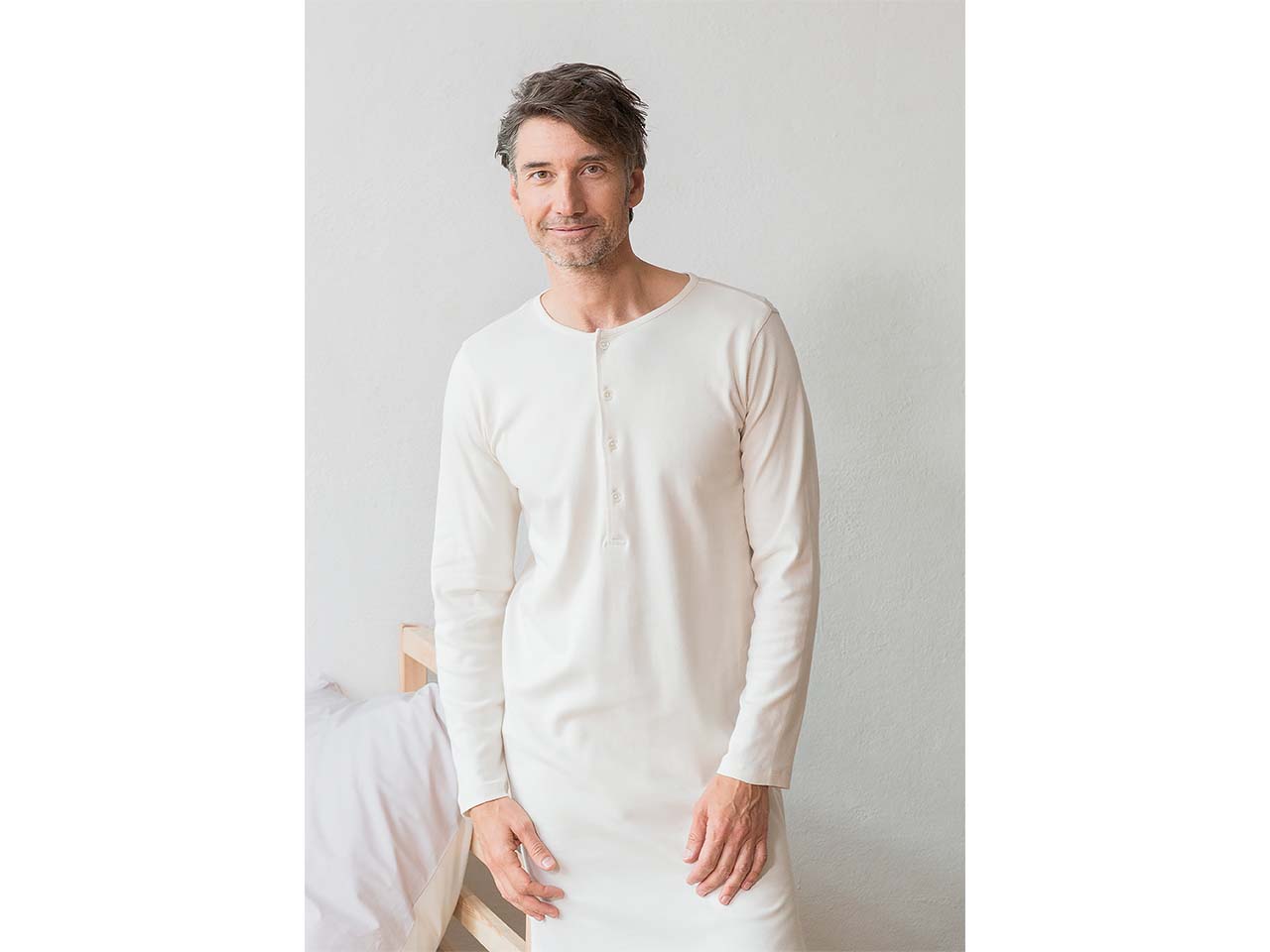 Klassisches Langarm-Nachthemd im zeitlosen Retro-Look! Höchster Tragekomfort entsteht durch die GOTS-zertifizierte Bio-Baumwolle in geschmeidiger Interlock-Jersey-Qualität, die sich angenehm weich auf der Haut anfühlt. Das Unisex-Nachthemd hat einen weiten Rundhalsausschnitt mit langer Vierknopfleiste, einen abgerundeten Saum mit Seitenschlitzen und Ärmelabschlüsse mit Doppelnahtsaum.