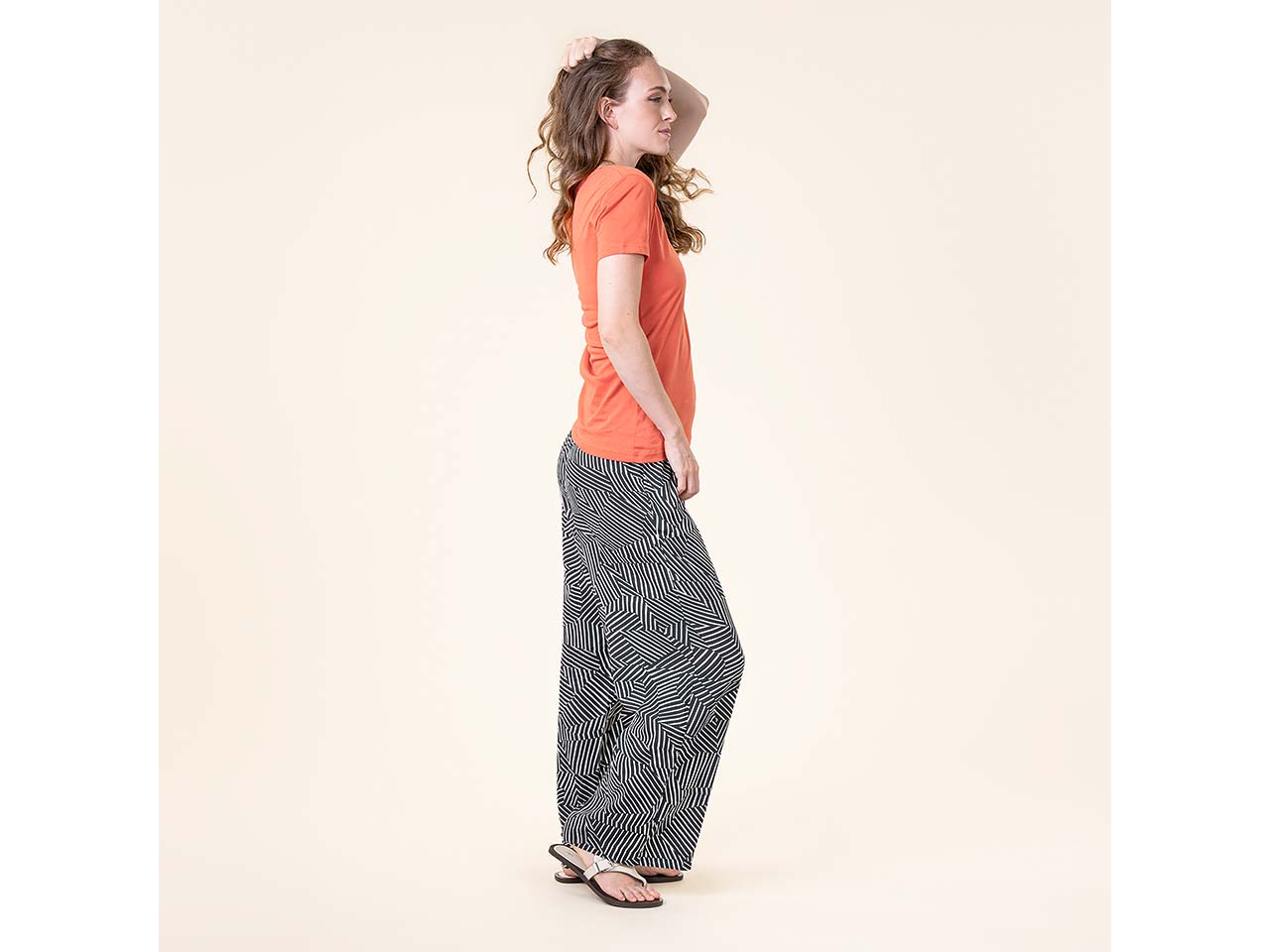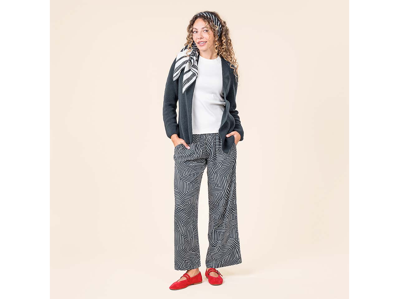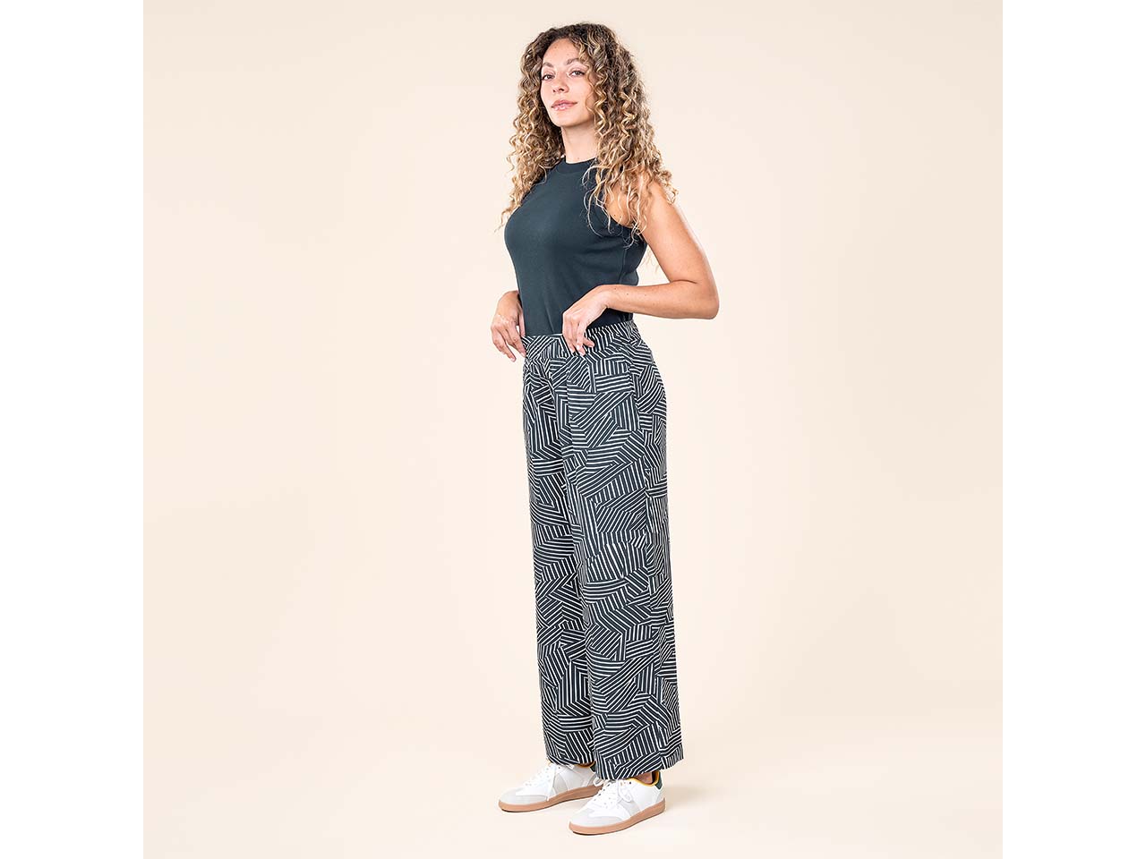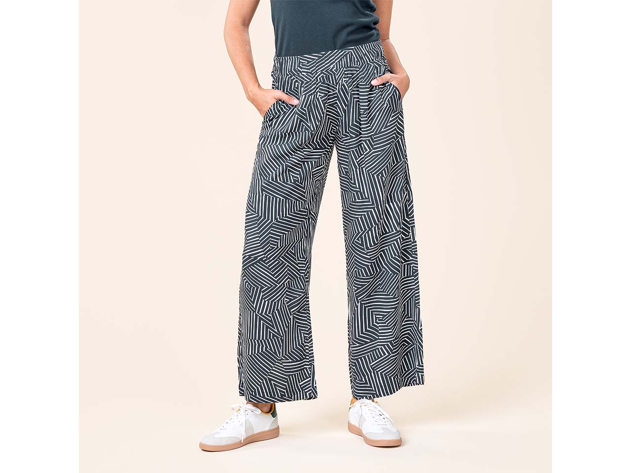 So schön sieht es aus, wenn modischer Style auf Nachhaltigkeit trifft! Gefertigt ist die Hose mit weit geschnittenem Bein aus EcoVero™-Viskose, die weich fließend fällt und kühlende Eigenschaften mitbringt. Das ist perfekt, wenn es im Sommer mal wieder so richtig warm ist. Die Culotte hat einen elastischen Bund, der für einen optimalen Sitz sorgt, ohne einzuschnüren. Auch an praktische Seitentaschen wurde bei der Hose gedacht! Der Musterprint verleiht dem Kleidungsstück einen charmanten Style, der vor allem zu unifarbenen Oberteilen wie Tops, Shirts oder Blusen passt.