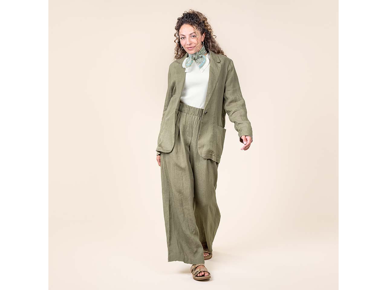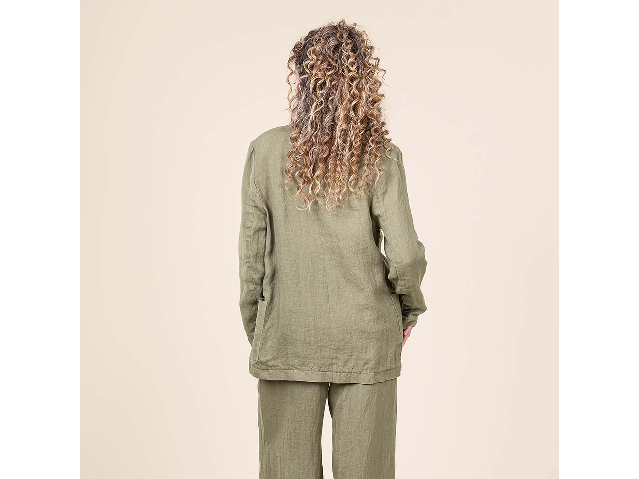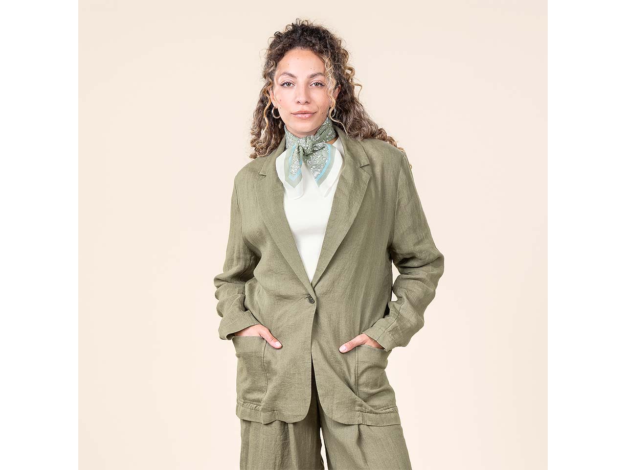 Stylische Jacke für Frühjahr und Sommer. Der Blazer-Stil verleiht dem Kleidungsstück eine besonders modische Note. Durch die Herstellung aus 100 % Leinen fühlt sich die Damenjacke immer angenehm leicht und luftig auf der Haut an. Weitere Highlights sind die leichten Schulterpolster, die aufgesetzten Taschen und die edlen Steinnussknöpfe. Ein echtes Must-have, das vielseitige Outfits komplettiert.
