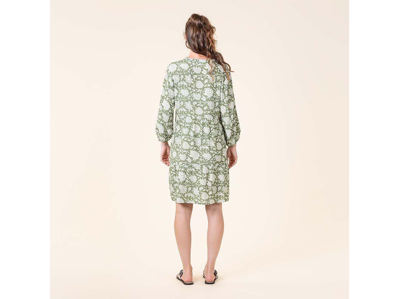 Dieses Midi-Kleid verströmt Sommergefühle! Weich fließendes, atmungsaktive EcoVero™-Viskose sorgt für einen Tragekomfort der Extraklasse. Das florale Design setzt modische Akzente und zaubert Damen ein Lächeln ins Gesicht. Raffinierte Details wie der V-Ausschnitt mit Bindeband, der Stufenrock oder die 3/4-Ärmel mit elastischem Saum runden das Kleidungsstück perfekt ab.