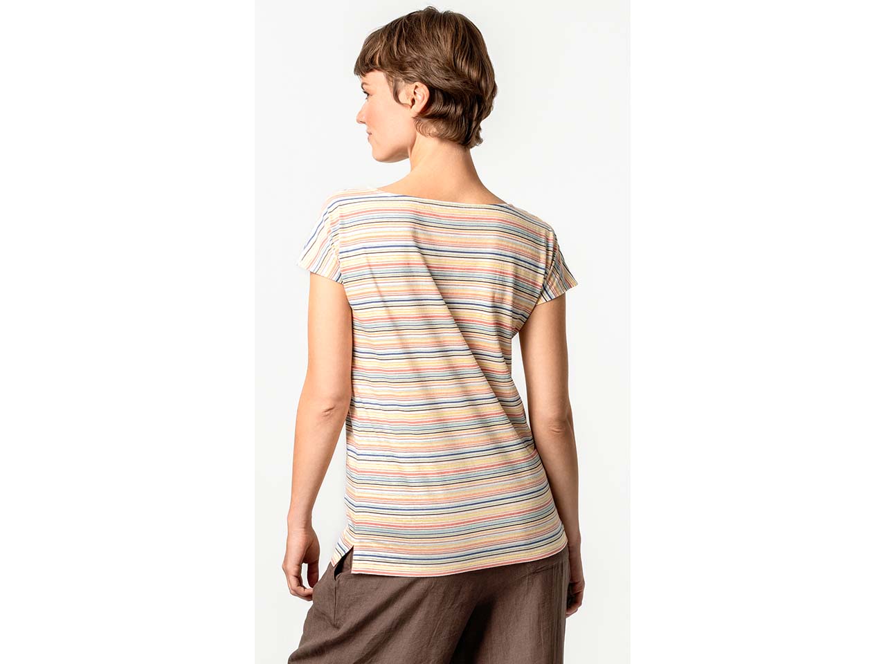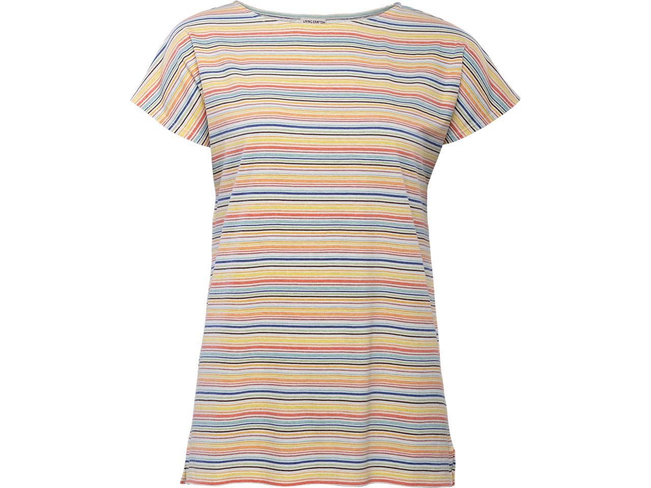 Dieses T-Shirt von Living Crafts bringt ganz viel Farbe in den sommerlichen Kleiderschrank! Der weiche Materialmix aus GOTS-zertifizierter Bio-Baumwolle und Leinen sorgt für einen luftig-leichten Tragekomfort. Gerade bei hohen Temperaturen ist das Material sehr angenehm zu tragen. Die angeschnittenen Ärmel unterstreichen den sommerlichen Look. Das Shirt ist ein echtes Basic, das mit den farbenfrohen Streifen besonders frisch und modern wirkt.