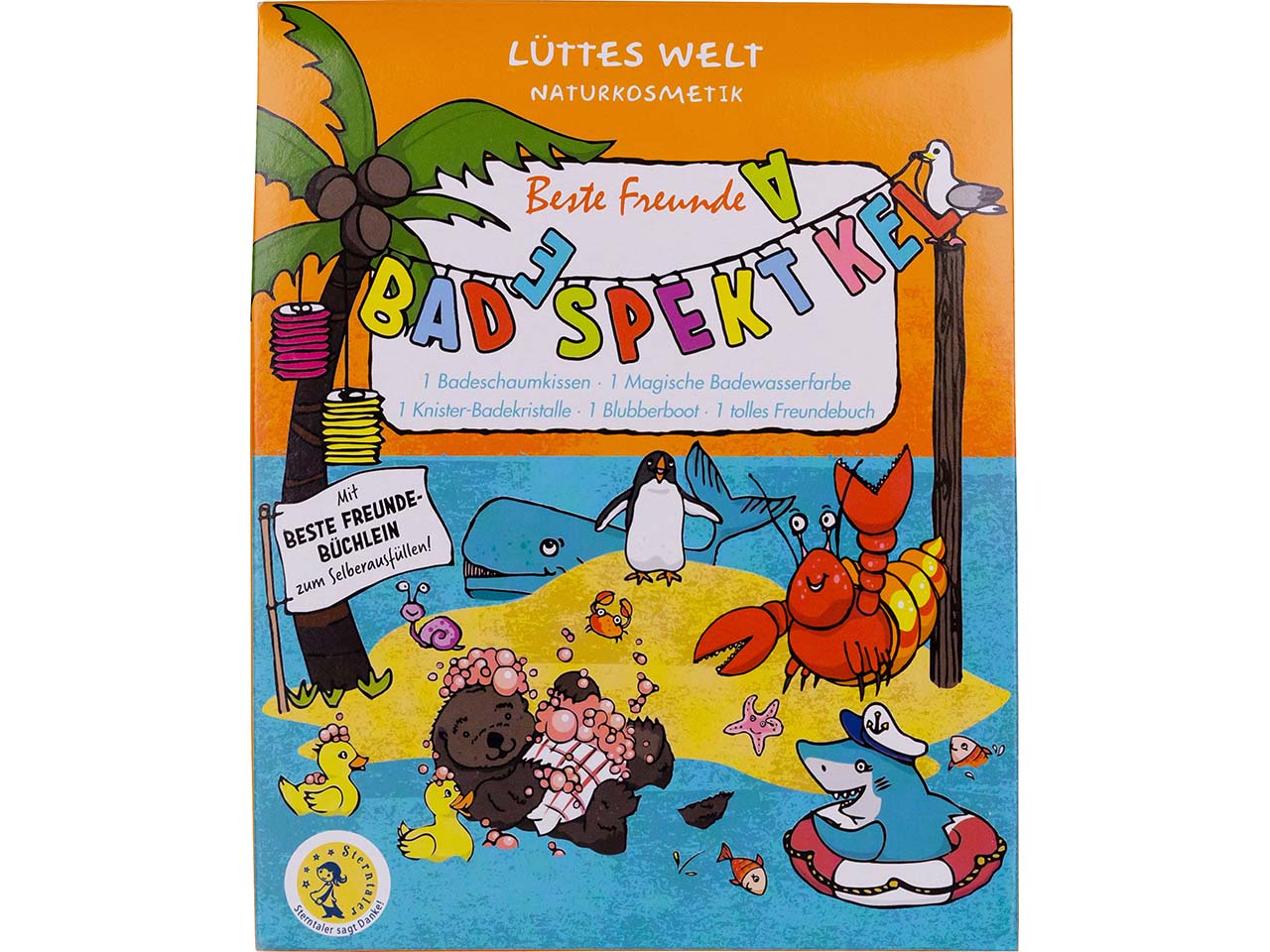 | Inhalt des Sets: | 1x Badeschaumkissen, 1x Magische Badewasserfarbe, 1x Knisterbadekristalle, 1x Blubberboot, 1x Beste Freunde-Büchlein |
