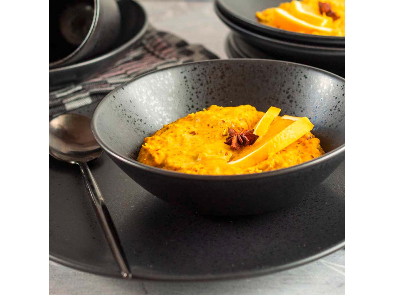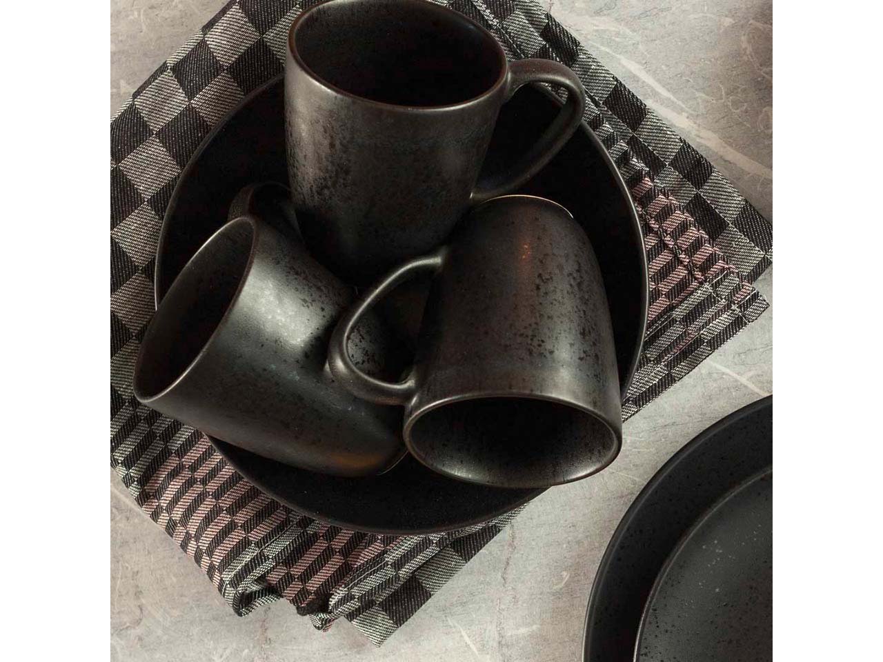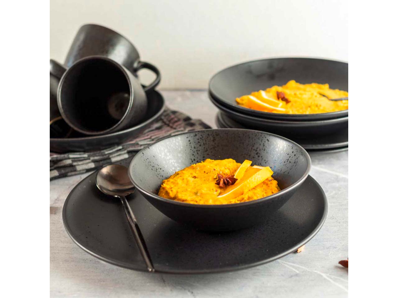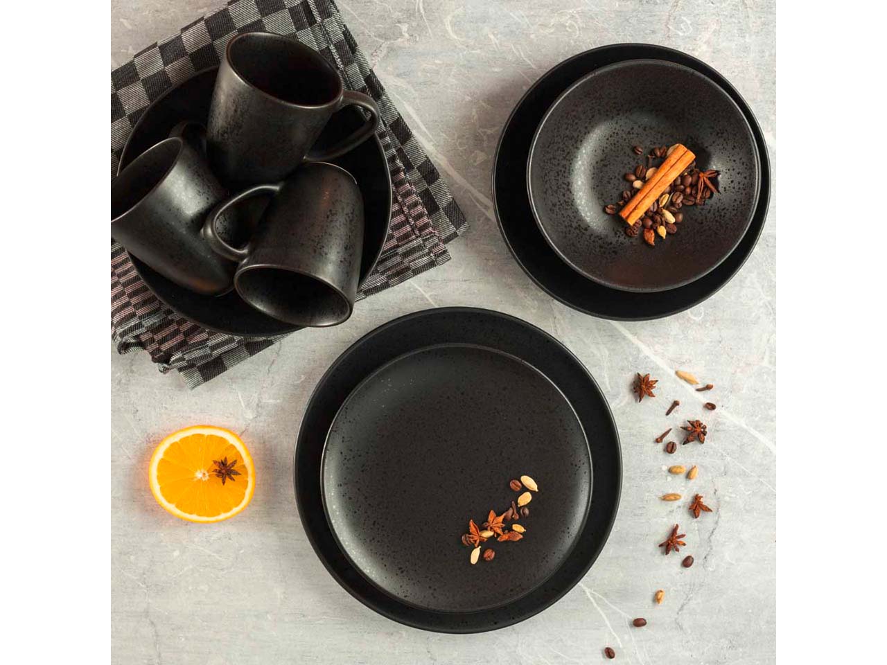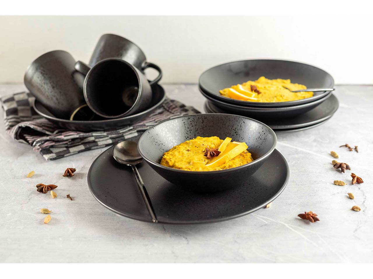 In diesem 18-teiligen Frühstücks-Geschirrset vereinen sich moderne Natürlichkeit und zeitlose Eleganz. Die Herstellung erfolgt aus regional gewonnenem Steinzeug in Portugal. Die Dessertteller, Schüsseln und Kaffeebecher überzeugen mit klaren, runden Coupe-Formen. Feine, glänzende schwarze Sprenkel setzen lebendige Akzente auf der matten, dunklen Glasur und verleihen dem Geschirr eine besondere Optik. Das Geschirrset ist für die Spülmaschine und die Mikrowelle geeignet.