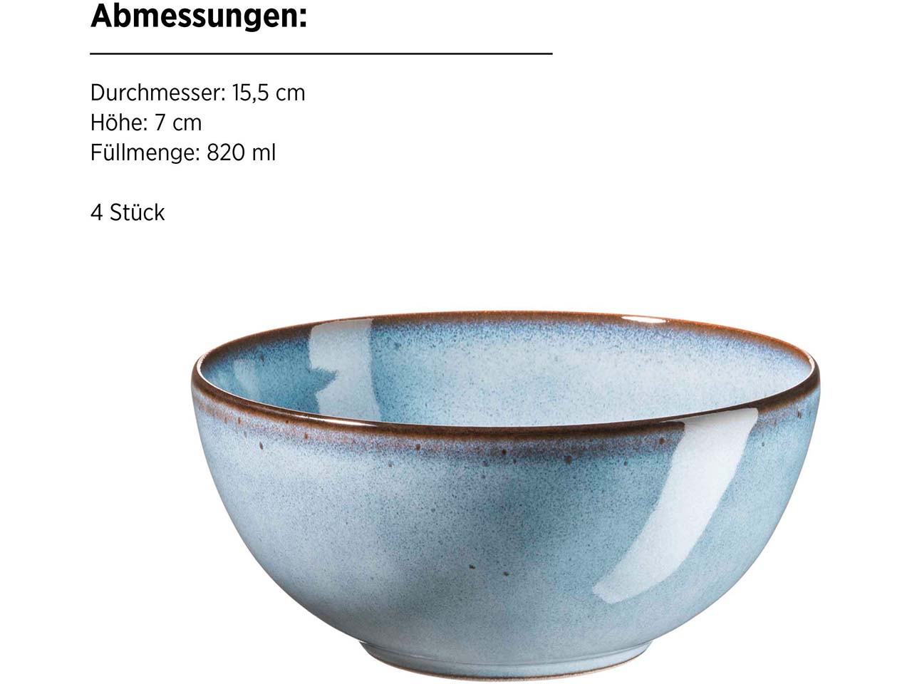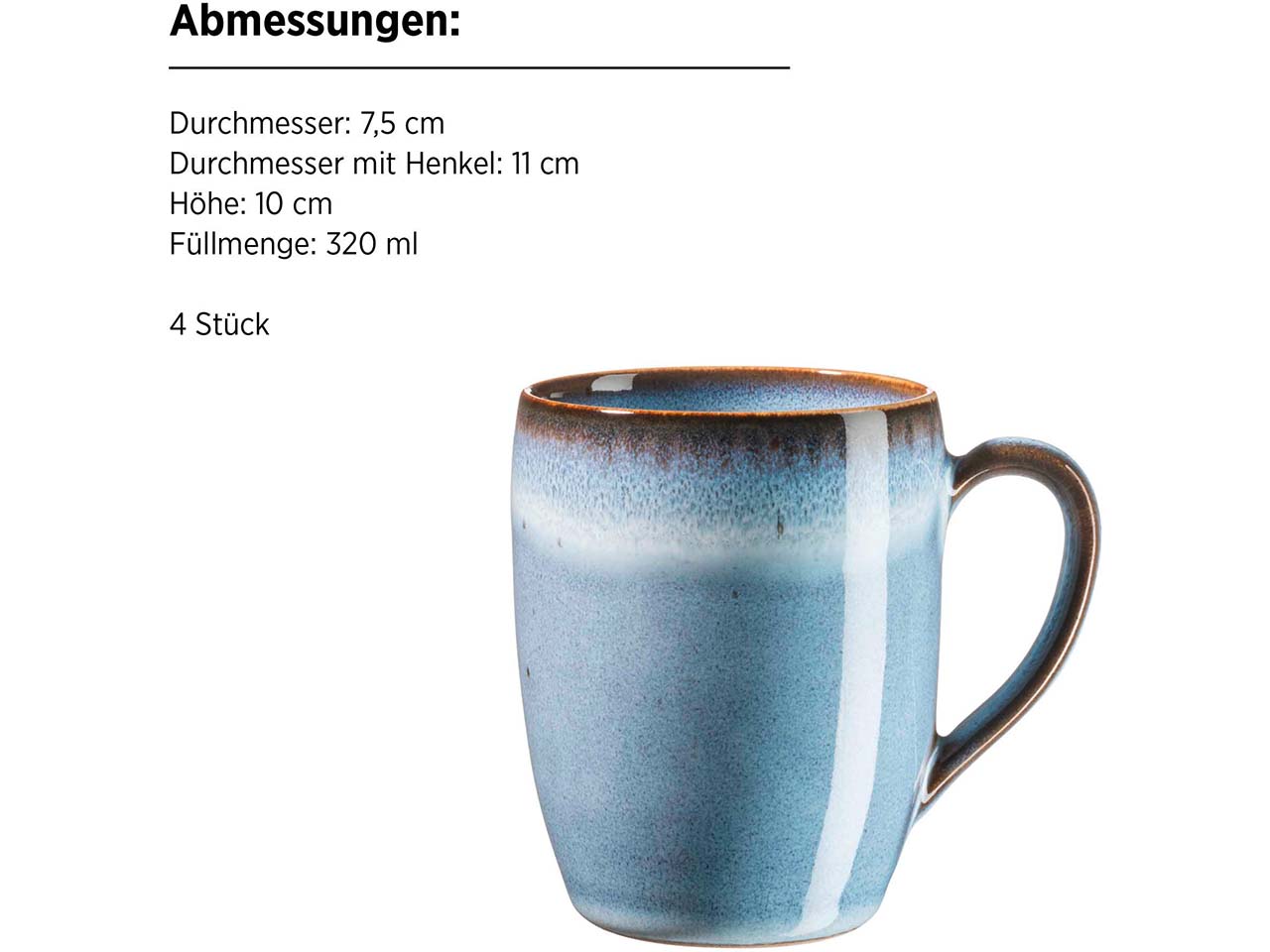 | Inhalt: | 4 x Desserteller 21 cm, 4 x Schüssel 16 cm, 4 x Kaffeebecher 325 ml |