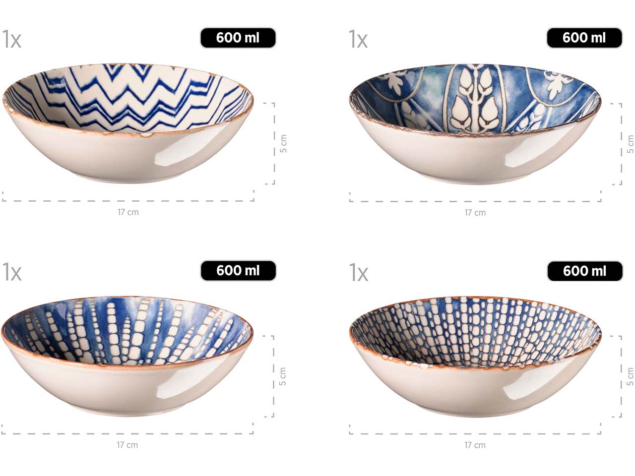 Die Designs im maurischen Stil sorgen für mediterranes Flair auf dem Esstisch! Das 5-teilige Salatschüssel-Set ist perfekt, um den Lieblingssalat zu genießen. Alle Schüsseln bestehen aus hochwertigem Steinzeug und werden in Portugal hergestellt. Das aufwendige Dekor ist nicht nur schick, sondern auch alltagstauglich: Die Schüsseln können bedenkenlos in die Spülmaschine oder in die Mikrowelle.