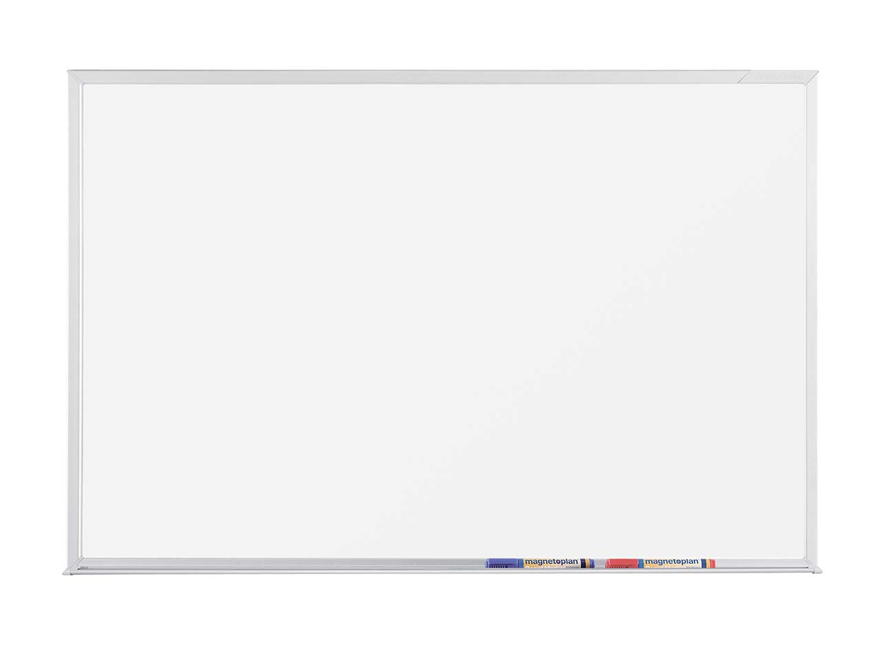 Magnethaftende Weißwandtafel mit Schreibfläche aus weiß emailliertem Stahlblech in Profiqualität von Magnetoplan. Die beidseitige Stahlblech-Auflage sorgt für höchste Stabilität, die Rückseite ist verzinkt. Profilrahmen und Ablageschale für Stifte bestehen aus solidem Aluminium. Der Kern aus mehrlagiger Recycling-Wellpappe macht die Tafel deutlich leichter als vergleichbare Spanplatten-Tafeln.