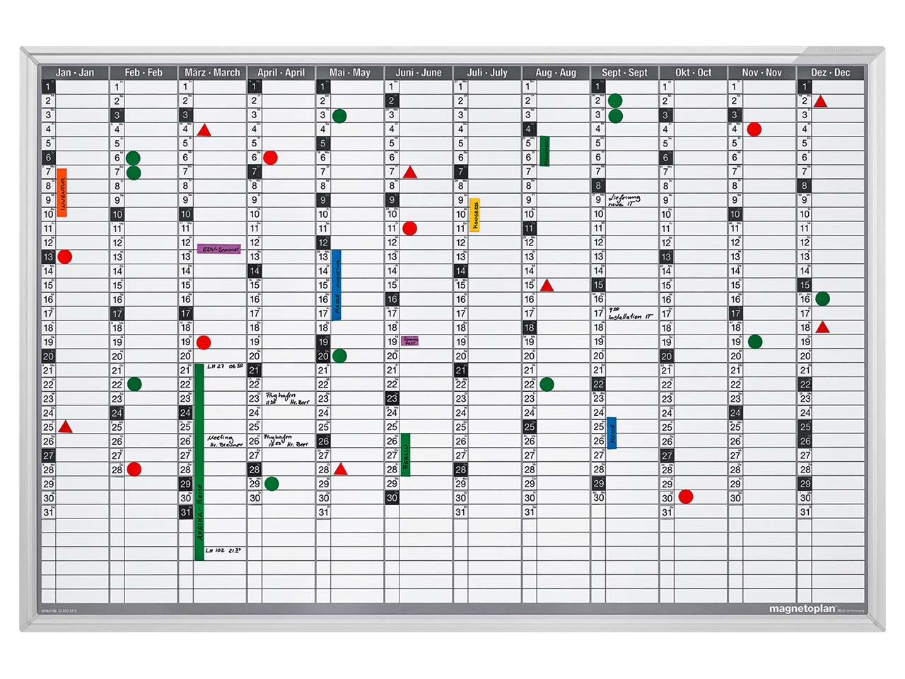 Mit dem Whiteboard wird eine permanente Jahresplanung ermöglicht. Dafür stehen Ihnen eingedruckte Monatsnamen und selbstklebende Kalenderstreifen von 1 bis 31 zur Verfügung. Sie können Termine in die Spalten eintragen und nach Ablauf einfach lösen. So lässt sich die Jahresübersicht über einen langen Zeitraum nutzen. Das Whiteboard kann ganz einfach mit Boardmarkern beschriftet und trocken oder feucht abgewischt werden. Stabilität erhält die Tafel durch den Rahmen aus eloxiertem Aluminium.