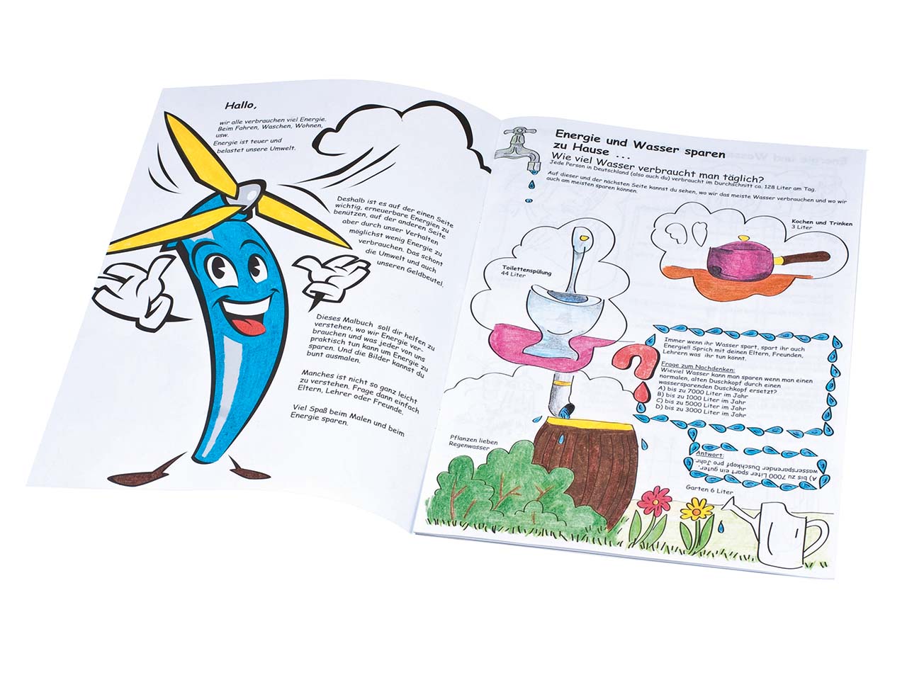"Mein Energiemalbuch" hilft Kindern auf spielerische und kreative Weise zu lernen, wie sie ganz einfach Energie einsparen können. Die 12 Seiten des Malbuchs sind kindgerecht gestaltet und führen zum Teil mit kurzen, erklärenden Texten in die Thematik ein. So lernen Kinder beim Ausmalen ganz nebenbei etwas darüber, wie sie Heizung, Strom und Wasser auf ökologische Weise nutzen. Es warten viele lustige Bilder darauf, mit Farbe zum Leben erweckt zu werden.