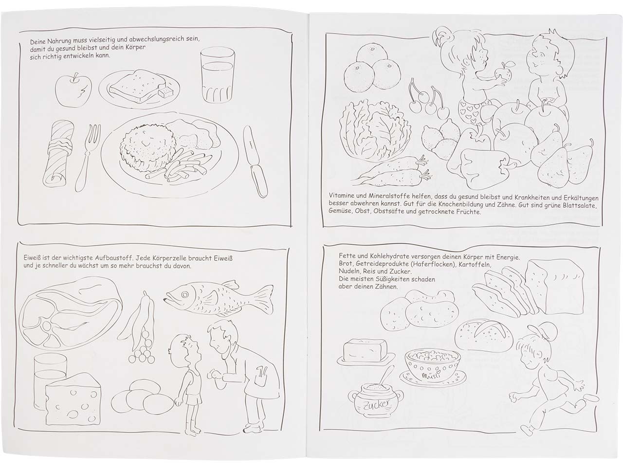Tee und Wasser zählen zu den besten Getränken, um den Durst zu löschen. Doch was gehört auf den Teller, um für Abwechslung und eine ausgewogene Ernährung zu sorgen? Antworten auf diese und viele andere spannende Fragen finden Kinder in diesem liebevoll gestalteten Malbuch. Auf spielerische Weise wird Wissen vermittelt, während zahlreiche Illustrationen darauf warten, mit Farbe zum Leben erweckt zu werden. Mit altersgerechten Tipps wird das Thema Ernährung kindgerecht und unterhaltsam aufbereitet. Das 12-seitige DIN-A4-Malbuch besteht vollständig aus Recyclingpapier.