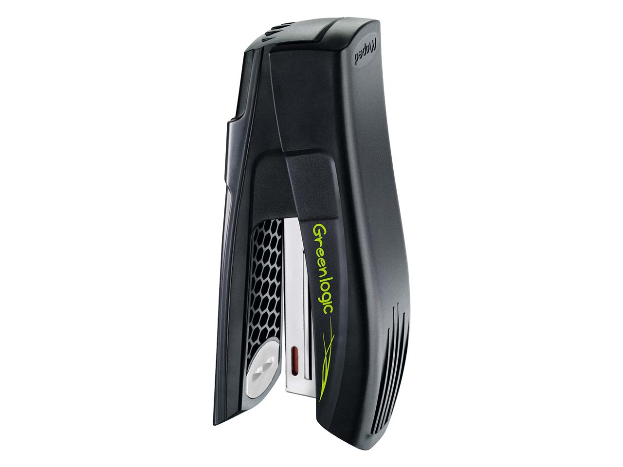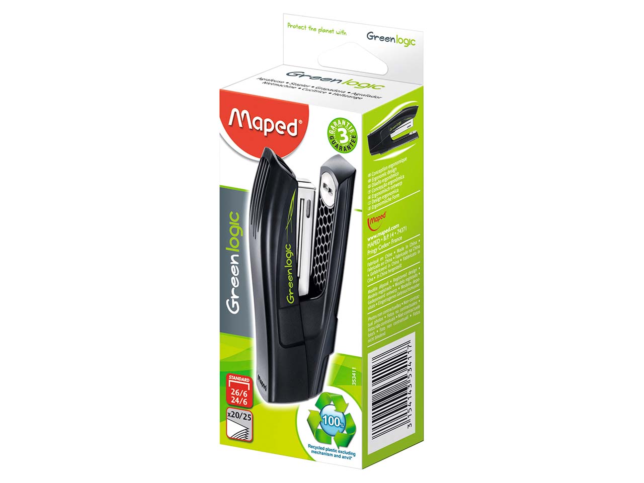 Das Maped Heftgerät "Greenlogic" ist aus Recyclingkunststoff hergestellt. Das Magazin bietet Platz für 100 Klammern 24/6 oder 130 Klammern 26/6. Es werden bis zu 25 Blatt geheftet. Die Papiereinlegetiefe beträgt 53 mm. B 15,7 x T 6,5 x H 4,1 cm.