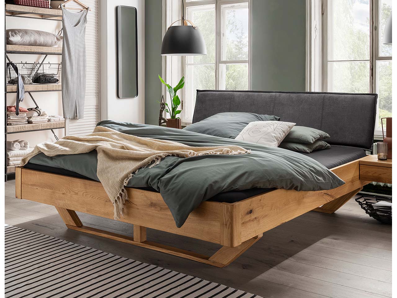 Natürlichkeit kombiniert mit Gemütlichkeit: Das Massivholzbett überzeugt mit der strapazierfähigen Qualität aus Wildeiche. Die lebendige, einzigartige Maserung ist immer ein Blickfänger und wirkt sehr natürlich. Dazu kommen die Kufen, die ebenfalls aus Holz bestehen und dem Gestell zu einer modernen Optik verhelfen. Highlight ist das weiche Polsterkopfteil, das dazu einlädt, sich im Bett auch mal hinzusetzen, ein Buch zu lesen oder einfach zu entspannen. Das Bett ist in verschiedenen Größen erhältlich, sodass es in fast jedes Schlafzimmer passt.