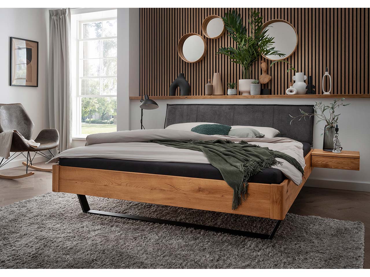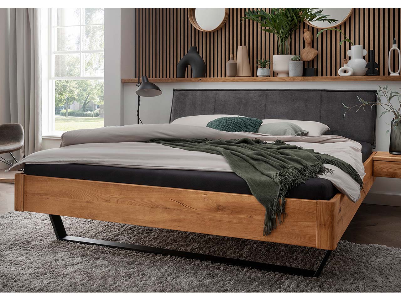 Dieses Massivholzbett bringt einfach alles mit: die lebendig gemaserter Wildeiche sorgt für harmonische Natürlichkeit, die Metallkufen unterstreichen die moderne Optik und das gepolsterte Kopfteil ist unglaublich bequem. Das Bettgestell überzeugt mit exzellenter Qualität und bereitet über viele Jahre Freude. Es ist ein Blickfänger im Schlafzimmer und fügt sich nahtlos in verschiedene Raumkonzepte ein. Durch das Kopfteil ist es auch möglich, sich im Bett hinzusetzen und zu entspannen. Das Bett ist in unterschiedlichen Größen erhältlich.