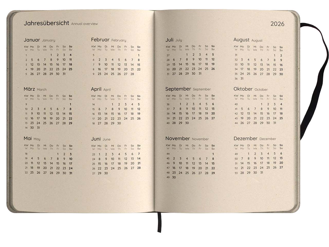 | Kalenderaufteilung: | 1 Woche/Doppelseite |