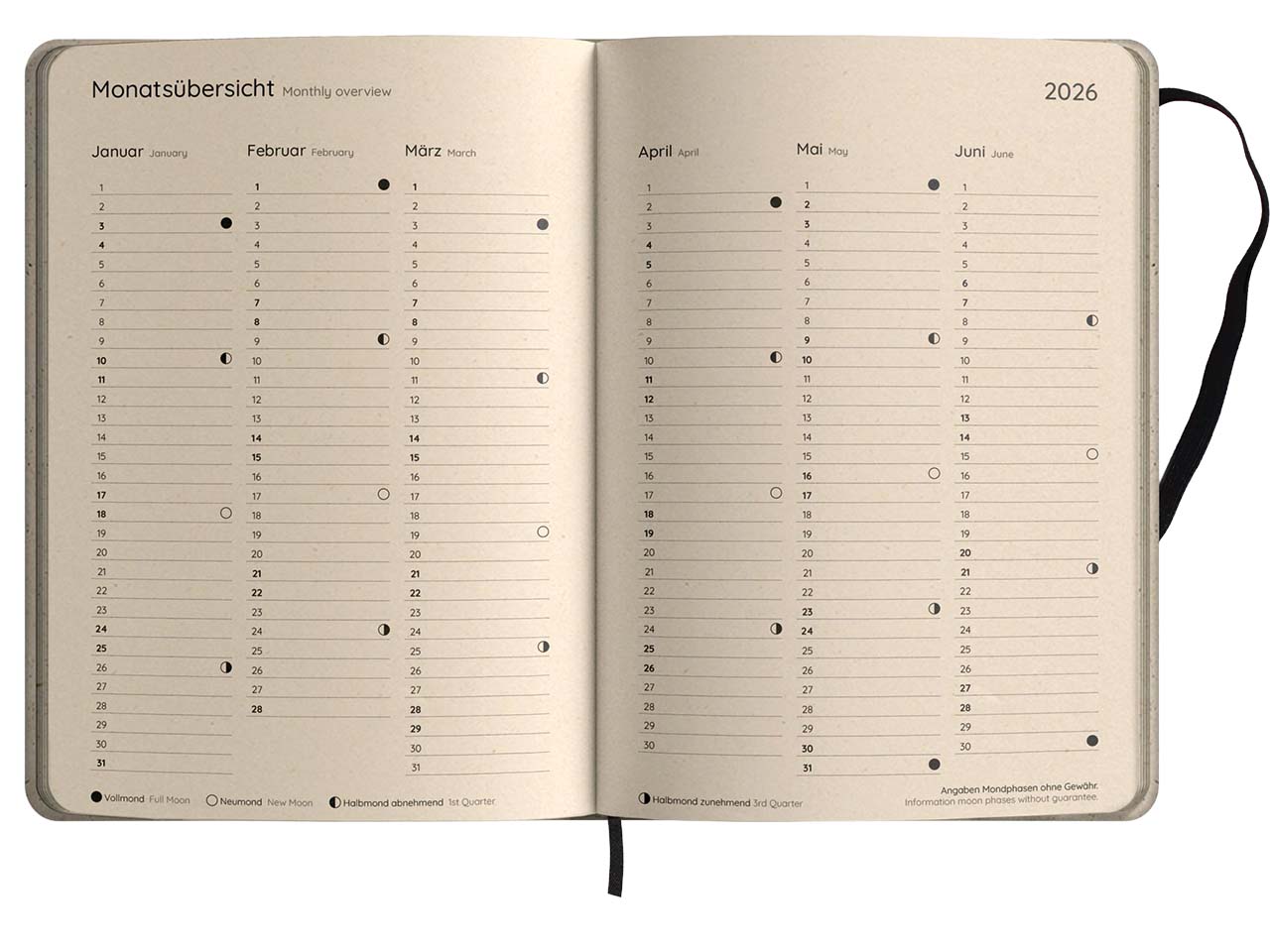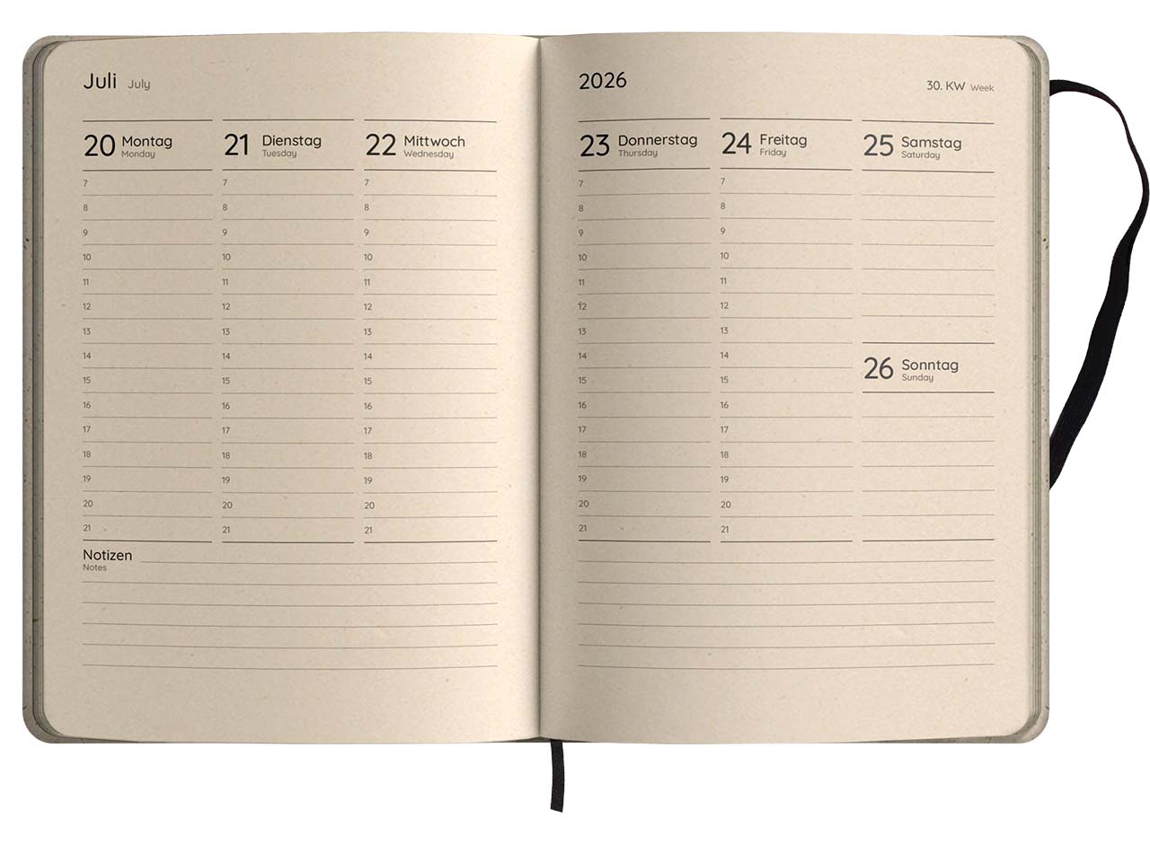 Das Hardcover für den Terminplaner wird mit Graspapier in Deutschland hergestellt. Dieses hat einen Grasfaseranteil von bis zu 50 %. Für den Frischfaseranteil werden ausschließlich Fasern von Bäumen aus verantwortungsvoller, FSC-zertifizierter Forstwirtschaft verwendet. Bei Gras handelt es sich um einen natürlichen Rohstoff, der in Deutschland in großen Mengen zur Verfügung steht und auch immer wieder nachwächst. Während des Aberntens wird das Gras nicht beschädigt oder gar zerstört. Das verwendete Gras wird in der Sonne zu Stroh getrocknet, bevor es in der Papierfabrik verarbeitet wird. Dafür werden pro Tonne nur rund 2 Liter Wasser benötigt – viel weniger als bei Frischfaserpapier! Auf diese Weise werden Ressourcen wie Wasser geschont.