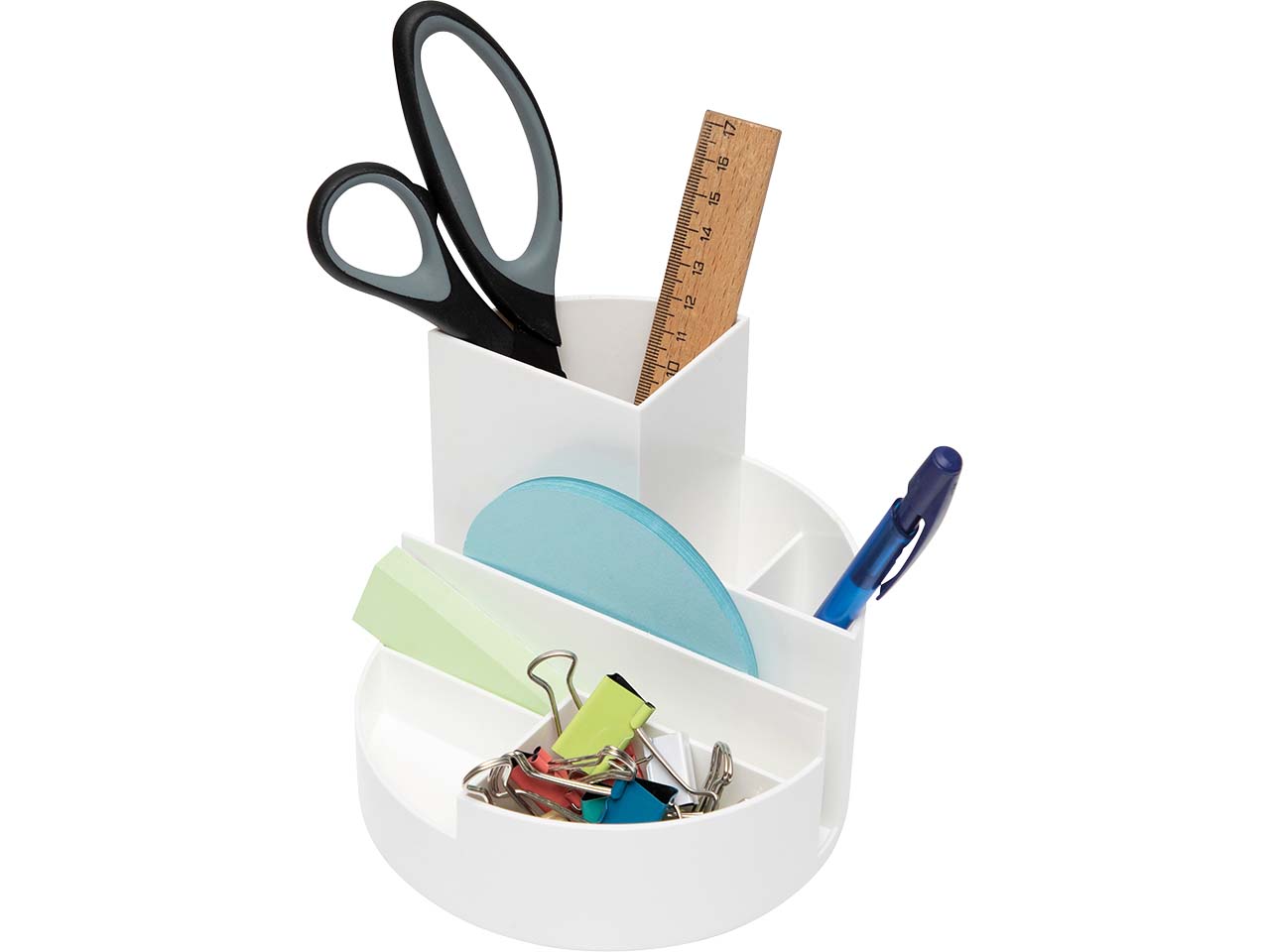 Mehr Ordnung auf dem Schreibtisch, der Arbeitsplatte oder in der Küche: Der Organizer ist ein Allrounder mit viel Platz und durchdachtem Design. Er besteht zu über 85 % aus recyceltem PS-Kunststoff und ist in Deutschland hergestellt. Die verschiedenen Behältergrößen ermöglichen die ordentliche Aufbewahrung von z.B. Büroklammern, Pins, Radiergummi, Stiften, Schere, Lineal und Pinseln. Zusätzlich verfügt der Organizer über einen Kartenständer, ein Zettel- und ein Handyfach.