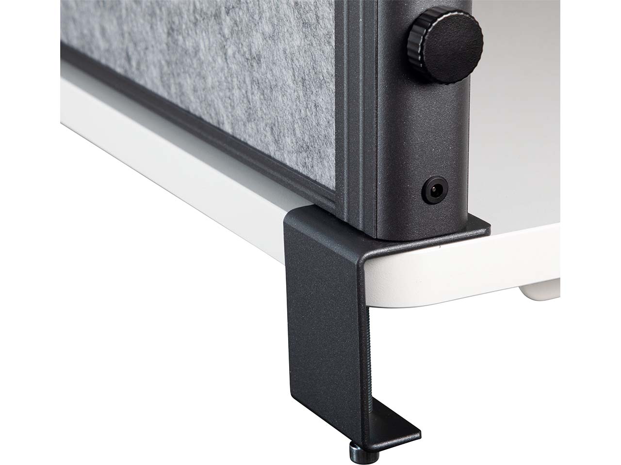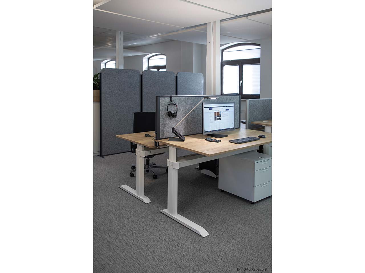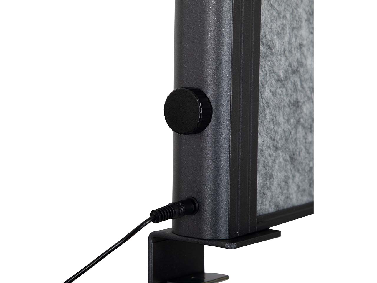 Die Akustik-Trennwand bietet nicht nur Sicht- und Schallschutz, sondern sorgt mit ihrem integrierten LED-Modul auch für eine indirekte, allgemeine Raumbeleuchtung. Die dimmbare LED-Leuchte strahlt nach oben ab und hat eine neutralweiße Lichtfarbe, die sich gut zum Arbeiten eignet. Über das seitliche Drehrad kann das Licht einfach gedimmt werden. So entsteht eine ganz individuelle Arbeitsatmosphäre. Die Trennwand ist die perfekte Lösung für Open Spaces. Der Geräuschpegel reduziert sich, sodass es einfacher ist, sich zu konzentrieren. Mit den zwei Klemmfüßen ist die Akustik-Trennwand stabil an Tischplatten mit bis zu 7,5 cm anzubringen. Sie eignet sich sogar für höhenverstellbare Tische. Die Trennwand hat ab Tischplatte 50 cm Höhe.