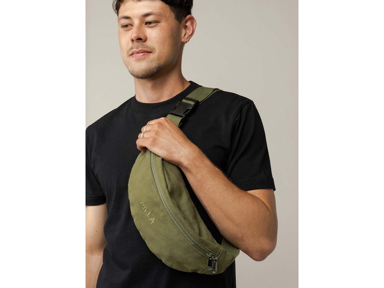 In den 90ern war sie Kult: die Bauchtasche. Jetzt ist sie zurück und das in modernem, lässigem Style. Die MELA Bauchtasche aus 100 % Fairtrade-Bio-Baumwolle setzt ein sportliches Fashion-Statement und ist dabei unglaublich praktisch. Das große Hauptfach und das zusätzliche Fach auf der Rückseite bewahren die wichtigen Dinge des Alltags wie Schlüssel, Smartphone oder Geldbeutel sicher auf. Beide verfügen über hochwertige YKK-Reißverschlüsse. Gerade das hintere Fach ist ideal, um Wertgegenstände zu verstauen z.B. auf Reisen, Konzerten oder in der Freizeit. Der dichte Baumwoll-Canvas fühlt sich angenehm leicht und dennoch stabil an. Dabei ist der Stoff schnelltrocknend und schützt vor leichtem Regen. Der Gurt des Hip Bags lässt sich individuell verstellen. Dadurch sind auch verschiedene Tragemöglichkeiten möglich! Die Gürteltasche kann für das perfekte Retro-Feeling am Bauch oder locker über der Schulter getragen werden.
